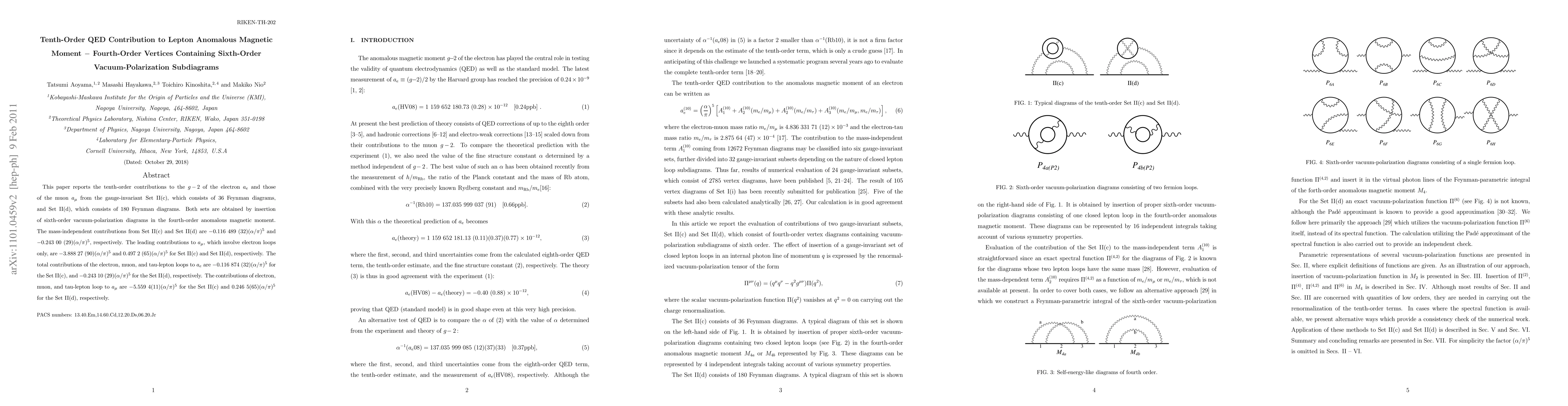 This paper calculates the tenth-order contributions to the anomalous magnetic moment of the electron and muon from gauge-invariant Feynman diagrams, incorporating sixth-order vacuum-polarization subdiagrams. The results show significant contributions from electron and muon loops, with specific values provided for each set of diagrams.