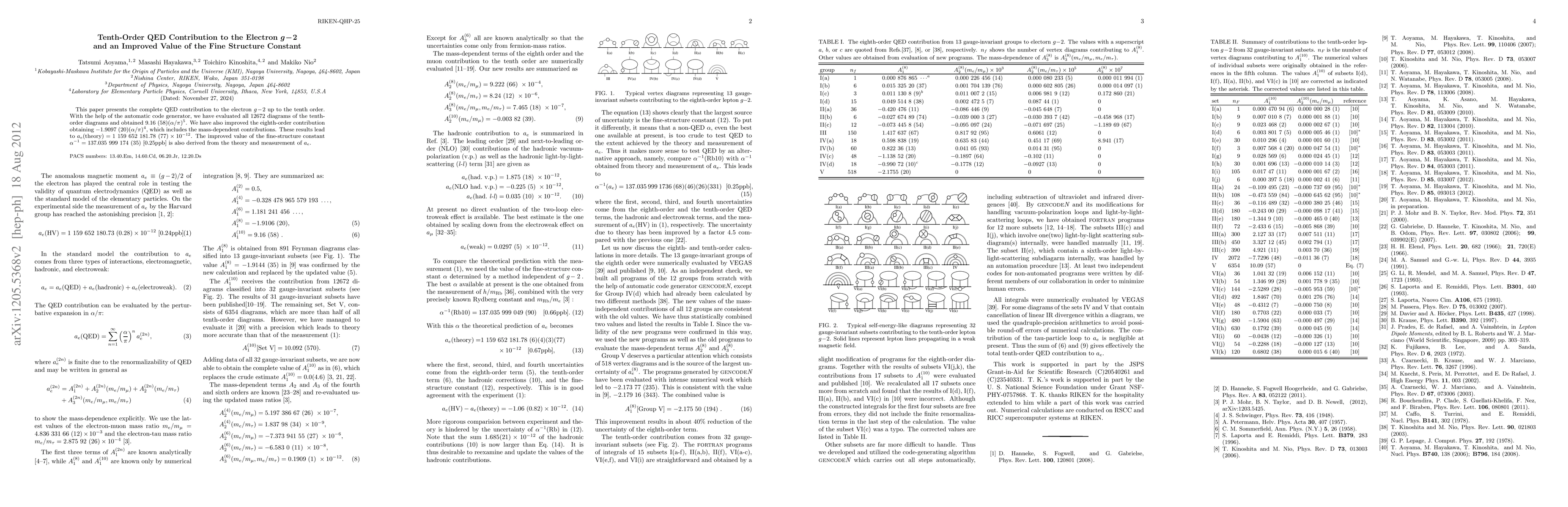This paper presents the complete QED contribution to the electron g-2 up to the tenth order. With the help of the automatic code generator, we have evaluated all 12672 diagrams of the tenth-order diagrams and obtained 9.16 (58)(\alpha/\pi)^5. We have also improved the eighth-order contribution obtaining -1.9097(20)(\alpha/\pi)^4, which includes the mass-dependent contributions. These results lead to a_e(theory)=1 159 652 181.78 (77) \times 10^{-12}. The improved value of the fine-structure constant \alpha^{-1} = 137.035 999 174 (35) [0.25 ppb] is also derived from the theory and measurement of a_e.