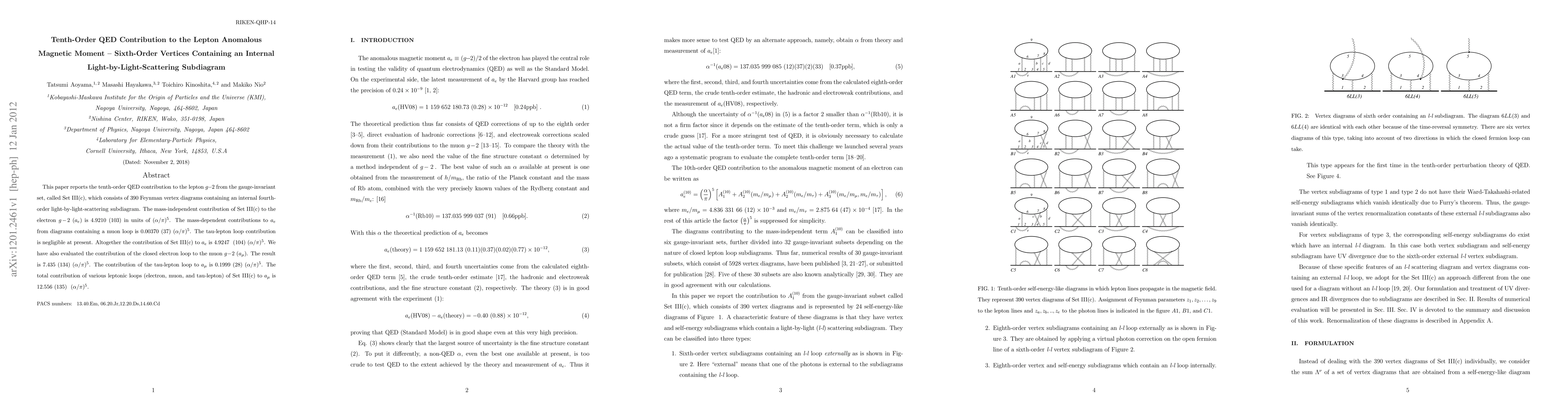 This paper calculates the tenth-order QED contribution to the lepton anomalous magnetic moment from Set III(c), which includes 390 Feynman diagrams with internal light-by-light-scattering subdiagrams. The electron's g-2 is significantly affected, with a total contribution of 4.9247 (104) (alpha/pi)^5, while muon and tau-lepton loops contribute 12.556 (135) (alpha/pi)^5 to the muon's g-2.