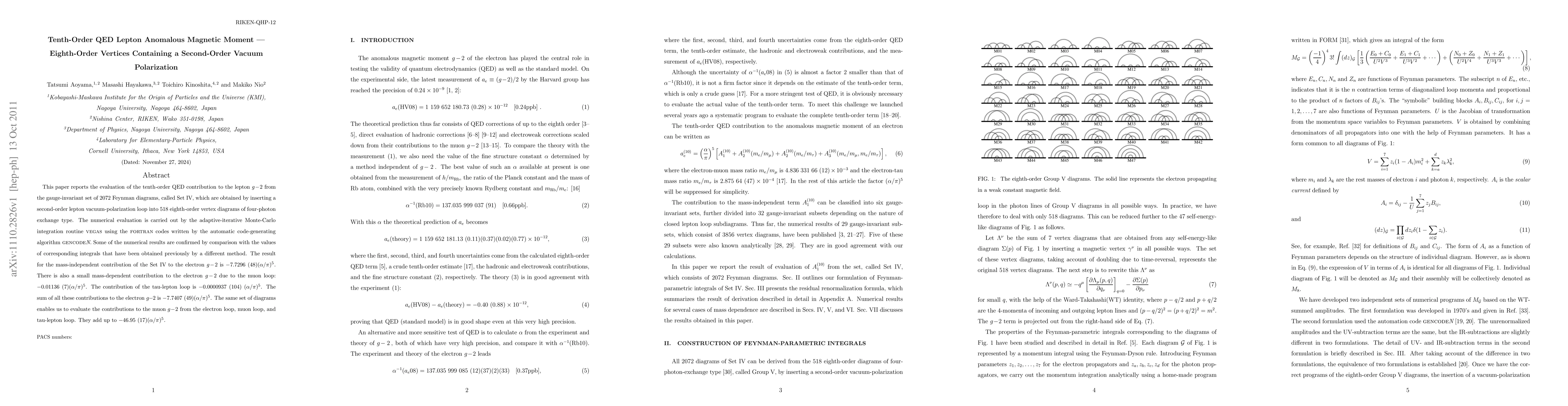 This paper evaluates the tenth-order QED contribution to the lepton anomalous magnetic moment (g-2) using 2072 Feynman diagrams derived from 518 eighth-order vertex diagrams. The results show significant contributions to the electron g-2 from second-order vacuum polarization loops, totaling $-7.7407(49) (\alpha/\pi)^5$, and a substantial contribution to the muon g-2 of $-46.95 (17) (\alpha/\pi)^5$.