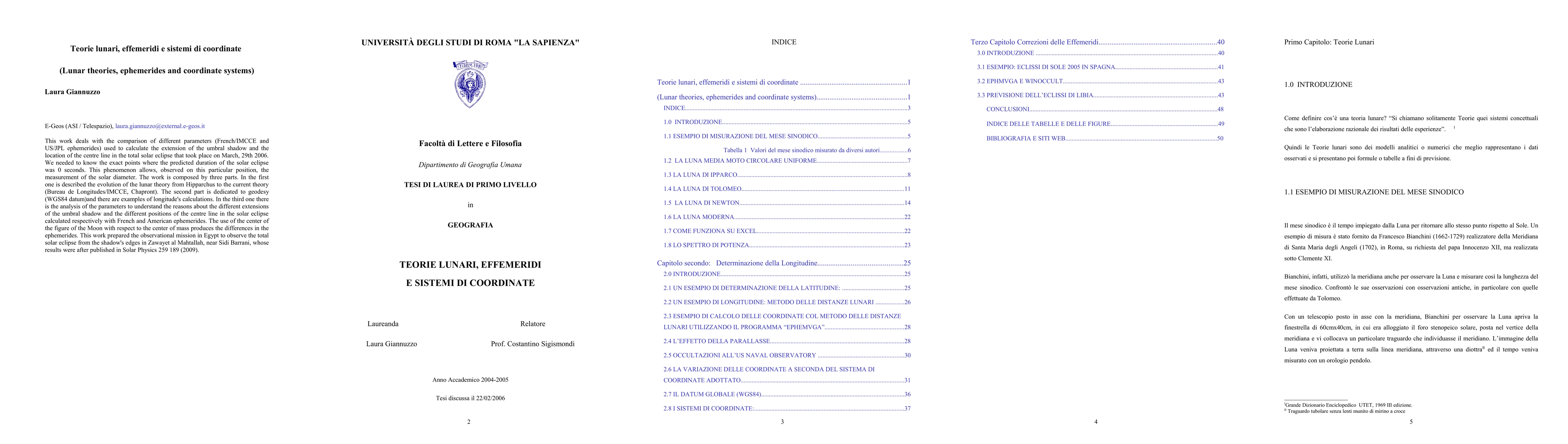 This work deals with the comparison of different parameters (French/IMCCE and US/JPL ephemerides) used to calculate the extension of the umbral shadow and the location of the centre line in the total solar eclipse that took place on March, 29th 2006. We needed to know the exact points where the predicted duration of the solar eclipse was 0 seconds. This phenomenon allows, observed on this particular position, the measurement of the solar diameter. The work is composed by three parts. In the first one is described the evolution of the lunar theory from Hipparchus to the current theory (Bureau de Longitudes/IMCCE, Chapront). The second part is dedicated to geodesy (WGS84 datum) and there are examples of longitude's calculations. In the third one there is the analysis of the parameters to understand the reasons about the different extensions of the umbral shadow and the different positions of the centre line in the solar eclipse calculated respectively with French and American ephemerides. The use of the center of the figure of the Moon with respect to the center of mass produces the differences in the ephemerides. This work prepared the observational mission in Egypt to observe the total solar eclipse from the shadow's edges in Zawayet al Mahtallah, near Sidi Barrani, whose results were after published in Solar Physics vol. 259 p. 189 (2009).