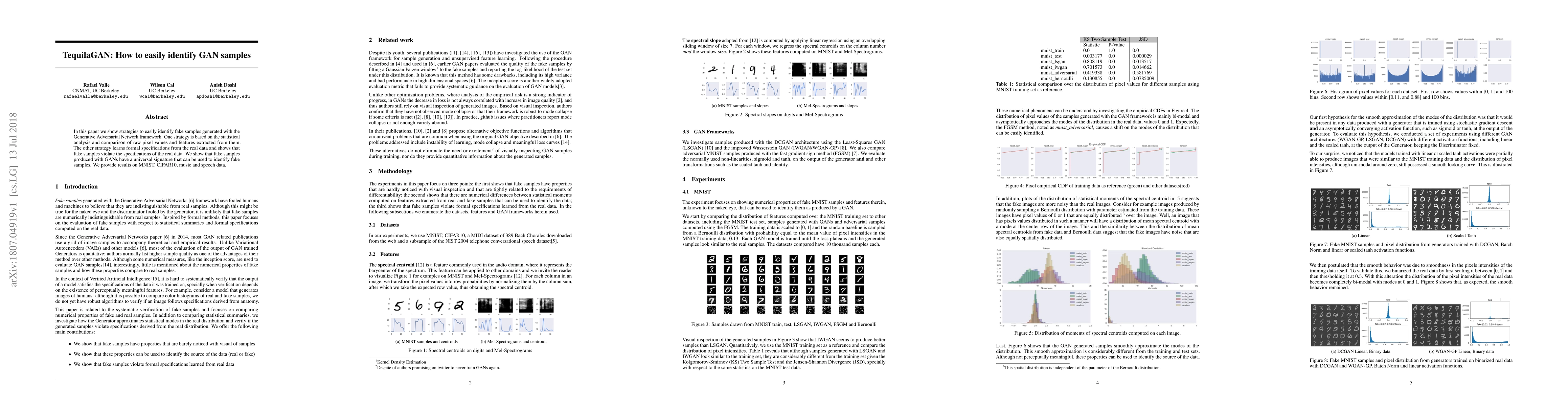 In this paper we show strategies to easily identify fake samples generated with the Generative Adversarial Network framework. One strategy is based on the statistical analysis and comparison of raw pixel values and features extracted from them. The other strategy learns formal specifications from the real data and shows that fake samples violate the specifications of the real data. We show that fake samples produced with GANs have a universal signature that can be used to identify fake samples. We provide results on MNIST, CIFAR10, music and speech data.