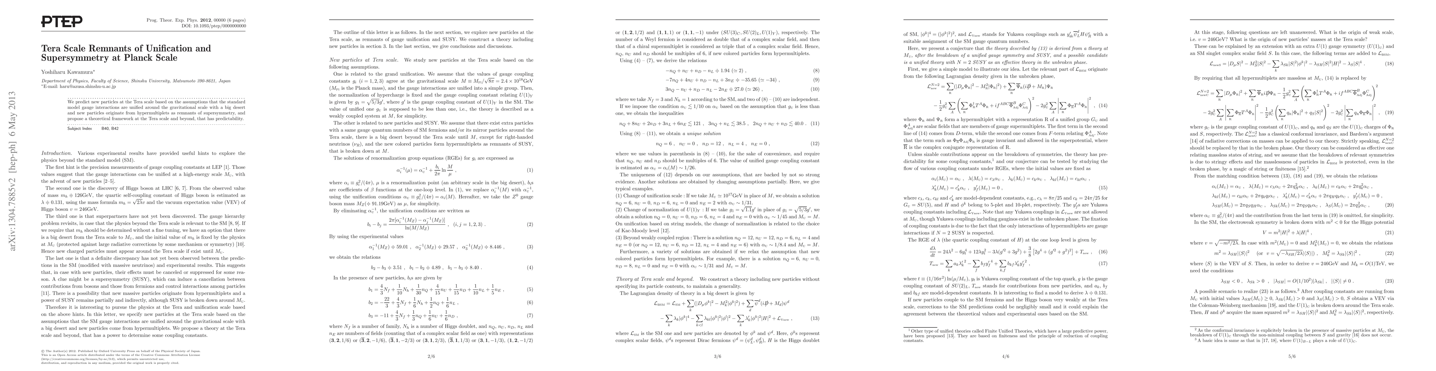 We predict new particles at the Tera scale based on the assumptions that the standard model gauge interactions are unified around the gravitational scale with a big desert and new particles originate from hypermultiplets as remnants of supersymmetry, and propose a theoretical framework at the Tera scale and beyond, that has predictability.
