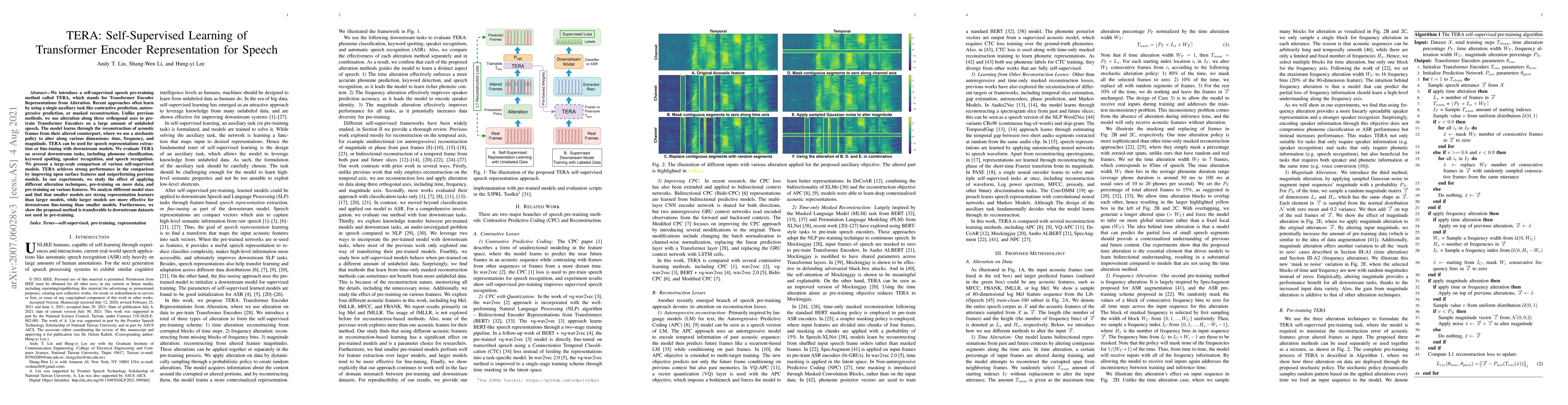 TERA is a self-supervised method for pre-training Transformer Encoders on speech using alteration along time, frequency, and magnitude axes. It achieves superior performance on various downstream tasks compared to previous models, demonstrating the effectiveness of smaller models for representation learning and larger models for fine-tuning.
