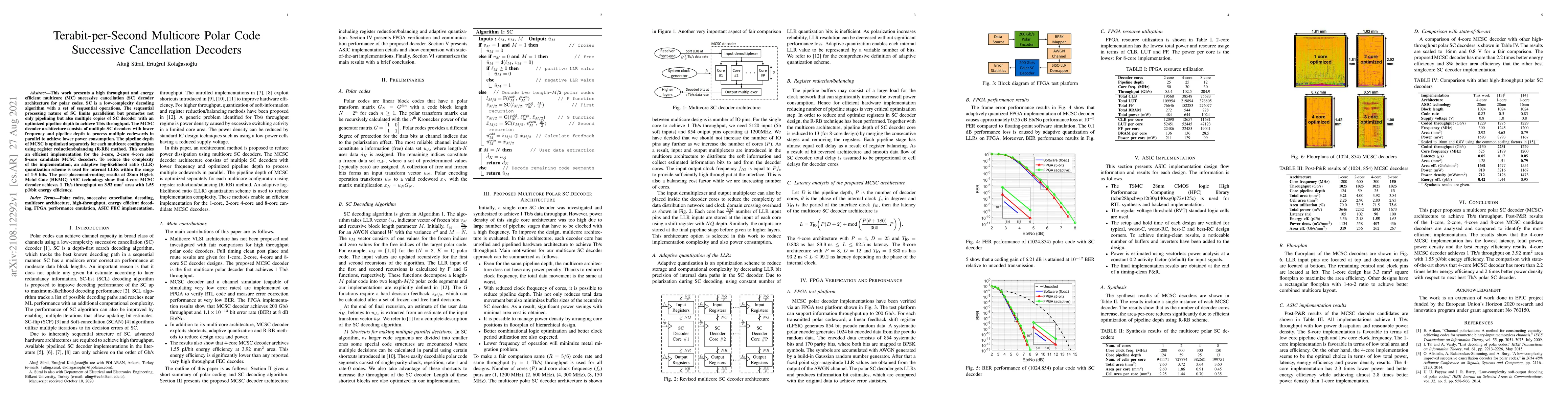 This paper introduces a high throughput, energy-efficient multicore successive cancellation decoder architecture for polar codes, achieving 1 Tb/s with optimized pipeline depth and adaptive LLR quantization, demonstrating significant power efficiency in 4-core configuration. The proposed method uses multiple lower frequency SC decoders to parallelize processing, achieving 1.55 pJ/bit energy efficiency in 28nm HKMG ASIC.