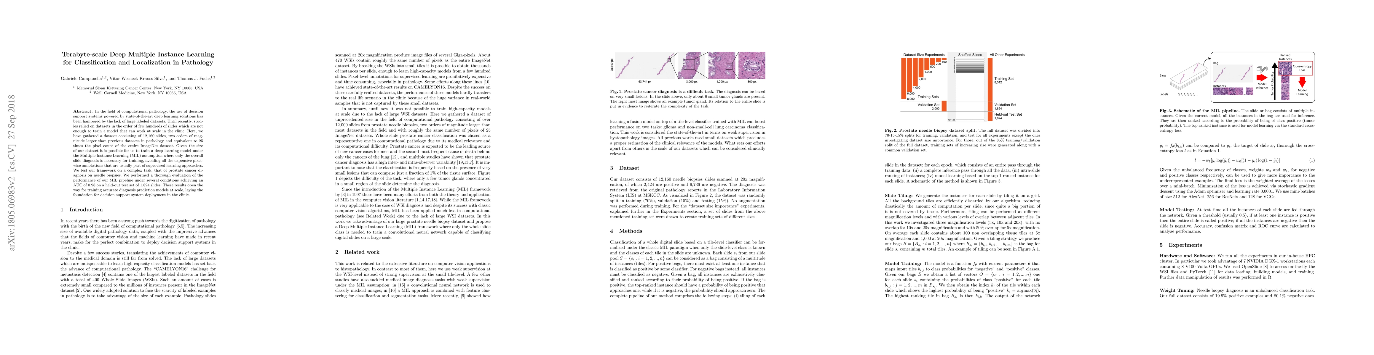 In the field of computational pathology, the use of decision support systems powered by state-of-the-art deep learning solutions has been hampered by the lack of large labeled datasets. Until recently, studies relied on datasets in the order of few hundreds of slides which are not enough to train a model that can work at scale in the clinic. Here, we have gathered a dataset consisting of 12,160 slides, two orders of magnitude larger than previous datasets in pathology and equivalent to 25 times the pixel count of the entire ImageNet dataset. Given the size of our dataset it is possible for us to train a deep learning model under the Multiple Instance Learning (MIL) assumption where only the overall slide diagnosis is necessary for training, avoiding all the expensive pixel-wise annotations that are usually part of supervised learning approaches. We test our framework on a complex task, that of prostate cancer diagnosis on needle biopsies. We performed a thorough evaluation of the performance of our MIL pipeline under several conditions achieving an AUC of 0.98 on a held-out test set of 1,824 slides. These results open the way for training accurate diagnosis prediction models at scale, laying the foundation for decision support system deployment in the clinic.
