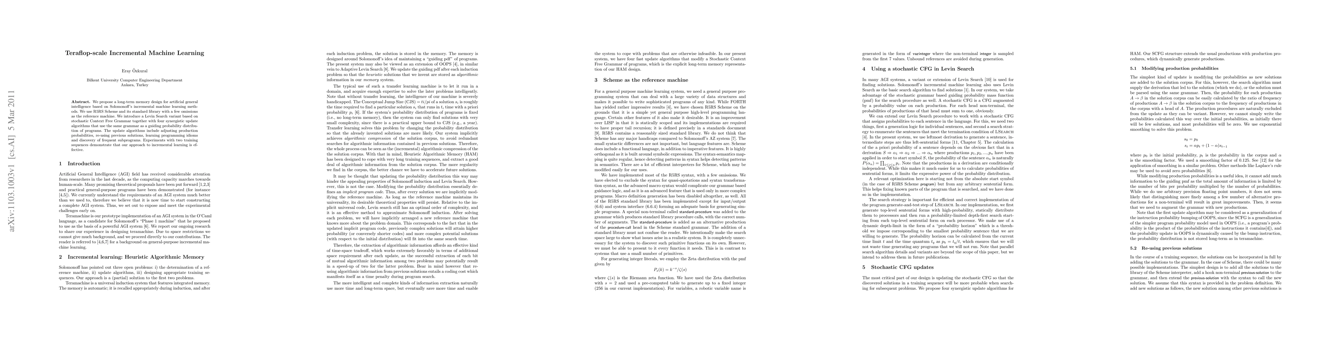We propose a long-term memory design for artificial general intelligence based on Solomonoff's incremental machine learning methods. We use R5RS Scheme and its standard library with a few omissions as the reference machine. We introduce a Levin Search variant based on Stochastic Context Free Grammar together with four synergistic update algorithms that use the same grammar as a guiding probability distribution of programs. The update algorithms include adjusting production probabilities, re-using previous solutions, learning programming idioms and discovery of frequent subprograms. Experiments with two training sequences demonstrate that our approach to incremental learning is effective.