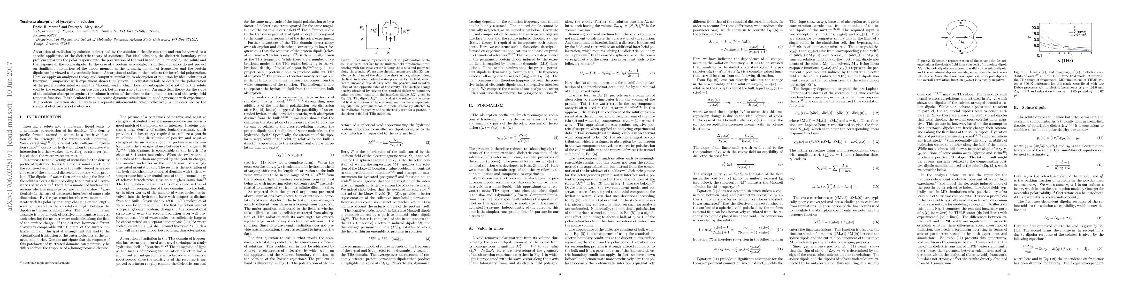 Absorption of radiation by solution is described by the solution dielectric constant and can be viewed as a specific application of the dielectric theory of solutions. For ideal solutions, the dielectric boundary value problem separates the polar response into the polarization of the void in the liquid created by the solute and the response of the solute dipole. In the case of a protein as a solute, its nuclear dynamics do not project on significant fluctuations of the dipole moment in the terahertz domain of frequencies and the protein dipole can be viewed as dynamically frozen. Absorption of radiation then reflects the interfacial polarization. Here we apply an analytical theory and computer simulation to absorption of radiation by ideal solutions of lysozyme. Comparison with experiment shows that Maxwell electrostatics fails to describe the polarization of the protein-water interface and the "Lorentz void", which does not anticipate polarization of the solute void by the external field (no surface charges), better represents the data. An analytical theory for the slope of the solution absorption against the volume fraction of the solute is formulated in terms of the cavity field response function. It is calculated from molecular dynamics simulations in good agreement with experiment. The protein hydration shell emerges as a separate sub-ensemble, which collectively is not described by the standard electrostatics of dielectrics.