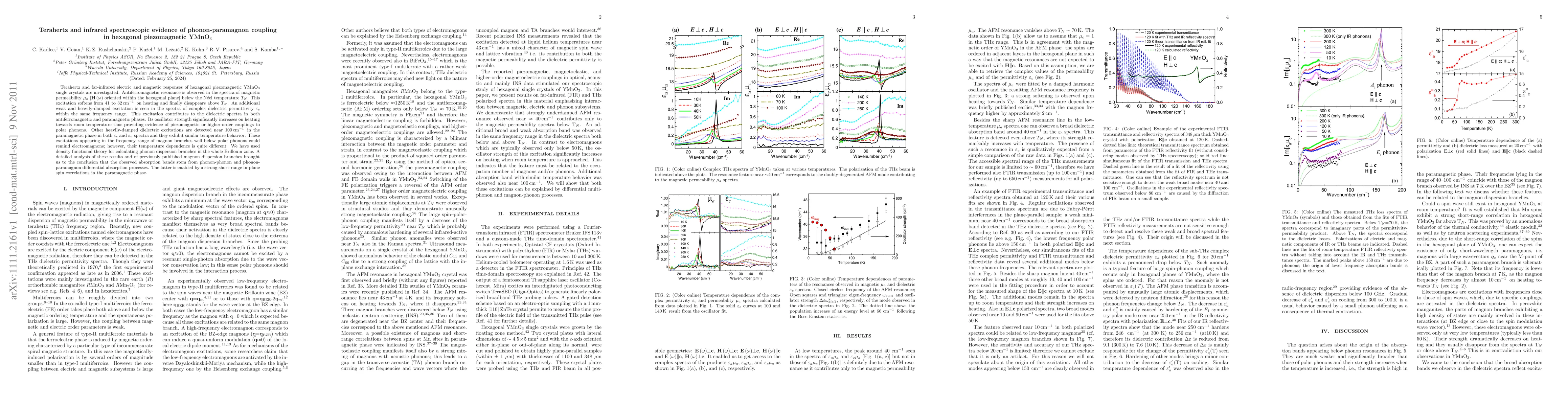 Terahertz and far-infrared electric and magnetic responses of hexagonal piezomagnetic YMnO3 single crystals are investigated. Antiferromagnetic resonance is observed in the spectra of magnetic permeability mu_a [H(omega) oriented within the hexagonal plane] below the Neel temperature T_N. This excitation softens from 41 to 32 cm-1 on heating and finally disappears above T_N. An additional weak and heavily-damped excitation is seen in the spectra of complex dielectric permittivity epsilon_c within the same frequency range. This excitation contributes to the dielectric spectra in both antiferromagnetic and paramagnetic phases. Its oscillator strength significantly increases on heating towards room temperature thus providing evidence of piezomagnetic or higher-order couplings to polar phonons. Other heavily-damped dielectric excitations are detected near 100 cm-1 in the paramagnetic phase in both epsilon_c and epsilon_a spectra and they exhibit similar temperature behavior. These excitations appearing in the frequency range of magnon branches well below polar phonons could remind electromagnons; however, their temperature dependence is quite different. We have used density functional theory for calculating phonon dispersion branches in the whole Brillouin zone. A detailed analysis of these results and of previously published magnon dispersion branches brought us to the conclusion that the observed absorption bands stem from phonon-phonon and phonon- paramagnon differential absorption processes. The latter is enabled by a strong short-range in-plane spin correlations in the paramagnetic phase.