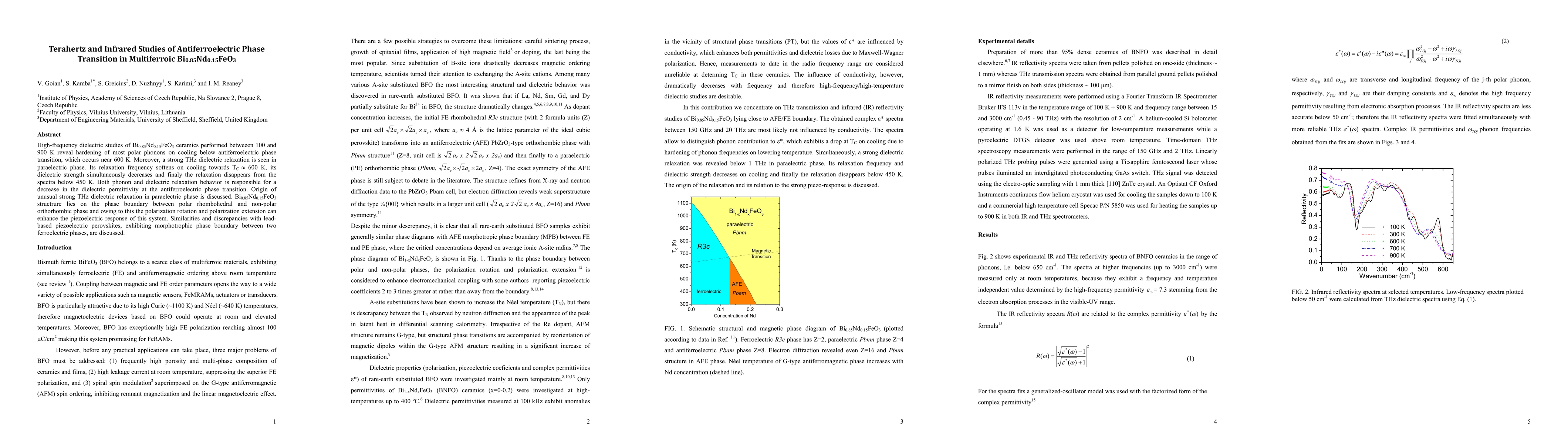 High-frequency dielectric studies of Bi_0.85Nd_0.15FeO_3 ceramics performed betweeen 100 and 900 K reveal hardening of most polar phonons on cooling below antiferroelectric phase transition, which occurs near 600 K. Moreover, a strong THz dielectric relaxation is seen in paraelectric phase. Its relaxation frequency softens on cooling towards Tc ~ 600 K, its dielectric strength simultaneously decreases and finaly the relaxation disappears from the spectra below 450 K. Both phonon and dielectric relaxation behavior is responsible for a decrease in the dielectric permittivity at the antiferroelectric phase transition. Origin of unusual strong THz dielectric relaxation in paraelectric phase is discussed. Bi_0.85Nd_0.15FeO_3 structrure lies on the phase boundary between polar rhombohedral and non-polar orthorhombic phase and owing to this the polarization rotation and polarization extension can enhance the piezoelectric response of this system. Similarities and discrepancies with lead-based piezoelectric perovskites, exhibiting morphotrophic phase boundary between two ferroelectric phases, are discussed.