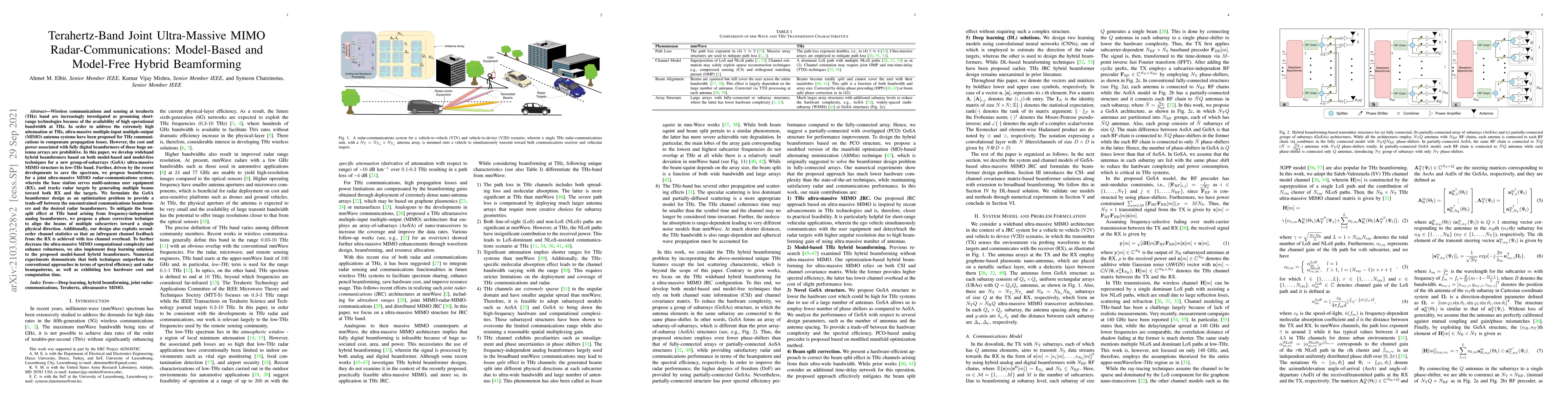 This paper proposes hybrid beamforming techniques for ultra-massive MIMO systems in the low-terahertz band to address high attenuation, combining model-based and model-free methods for joint radar-communications. It introduces a phase correction technique and deep learning solutions to optimize beamforming, achieving better spectral efficiency and radar performance while reducing computational complexity.