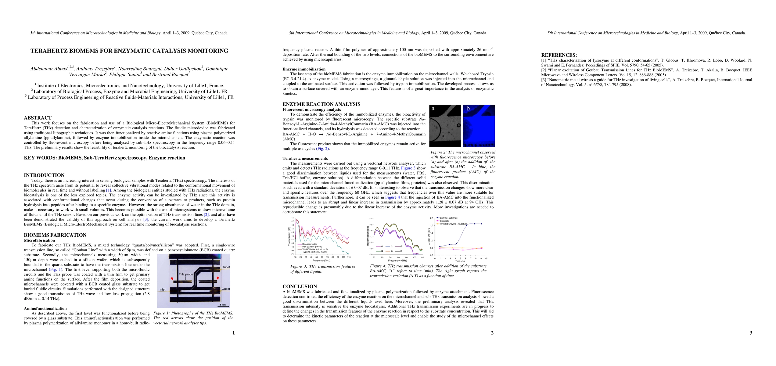 This work focuses on the fabrication and use of a Biological Micro-ElectroMechanical System (BioMEMS) for TeraHertz (THz) detection and characterization of enzymatic catalysis reactions. The fluidic microdevice was fabricated using traditional lithographic techniques. It was then functionalized by reactive amine functions using plasma polymerized allylamine (pp-allylamine), followed by enzyme immobilization inside the microchannels. The enzymatic reaction was controlled by fluorescent microscopy before being analysed by sub-THz spectroscopy in the frequency range 0.06--0.11 THz. The preliminary results show the feasibility of terahertz monitoring of the biocatalysis reaction.