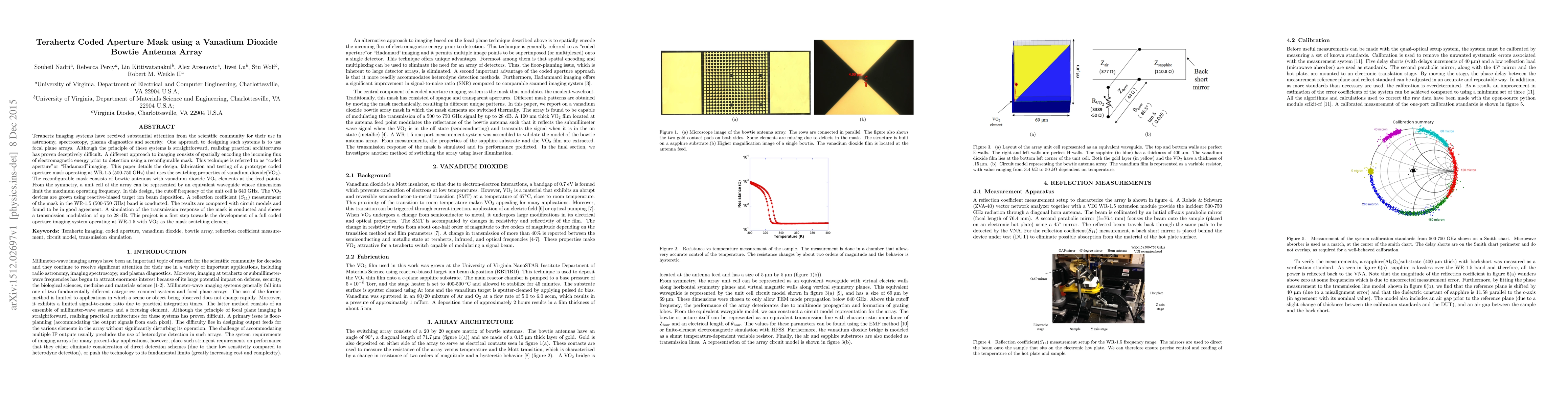 The research details the design, fabrication, and testing of a prototype coded aperture mask operating at WR 1.5 (500 to 750 GHz) using vanadium dioxide (VO2) for switching properties. The mask consists of bowtie antennas with VO2 elements at the feed points, modeled as an equivalent waveguide and circuit representation.
