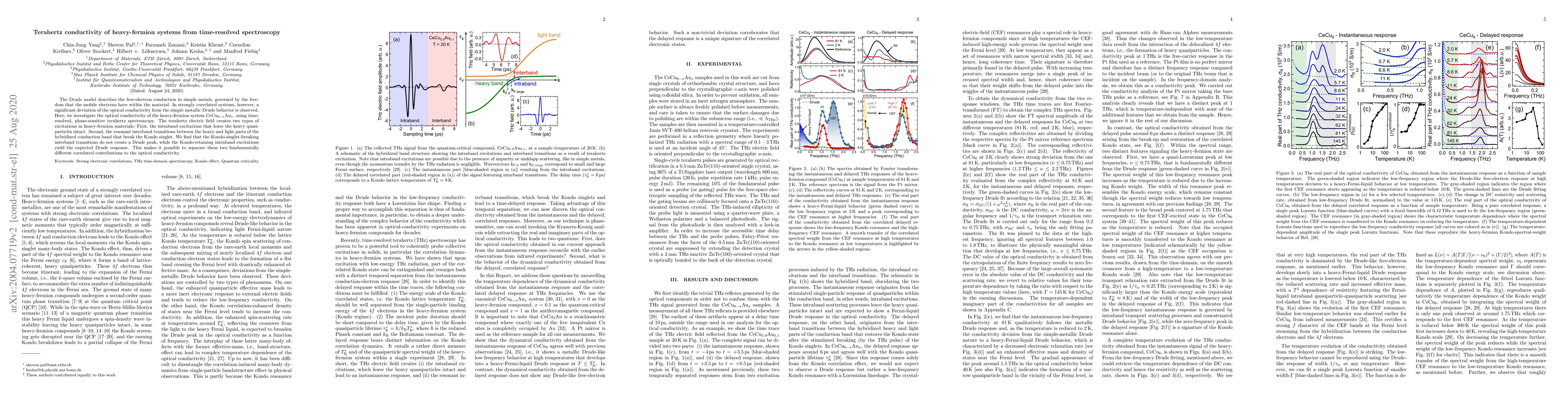 The Drude model describes the free-electron conduction in simple metals, governed by the freedom that the mobile electrons have within the material. In strongly correlated systems, however, a significant deviation of the optical conductivity from the simple metallic Drude behavior is observed. Here, we investigate the optical conductivity of the heavy-fermion system CeCu$_{\mathrm{6-x}}$Au$_{\mathrm{x}}$, using time-resolved, phase-sensitive terahertz spectroscopy. Terahertz electric field creates two types of excitations in heavy-fermion materials: First, the intraband excitations that leave the heavy quasiparticles intact. Second, the resonant interband transitions between the heavy and light parts of the hybridized conduction band that break the Kondo singlet. We find that the Kondo-singlet breaking interband transitions do not create a Drude peak, while the Kondo-retaining intraband excitations yield the expected Drude response; thus, making it possible to separate these two fundamentally different correlated contributions to the optical conductivity.