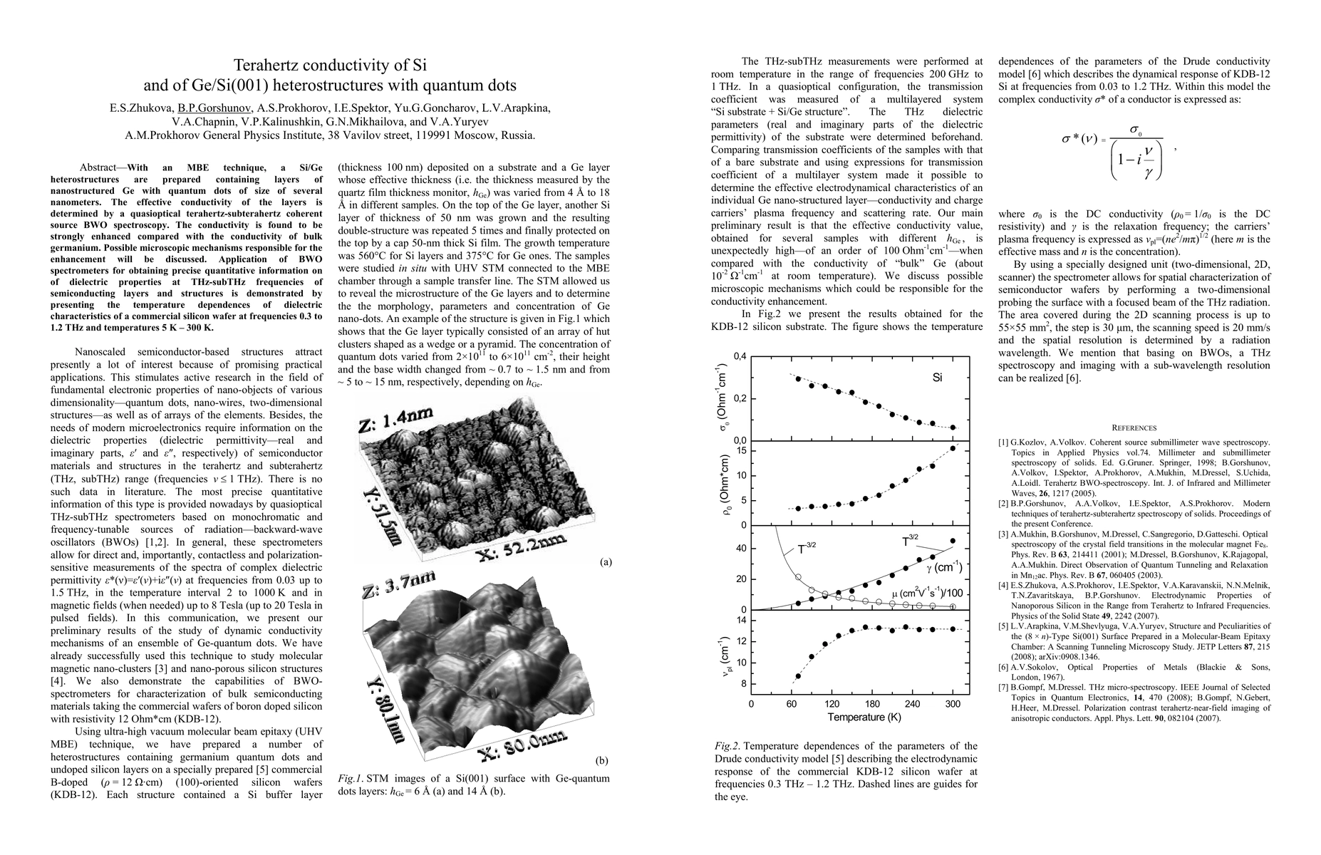 With an MBE technique, a Si/Ge heterostructures are prepared containing layers of nanostructured Ge with quantum dots of size of several nanometers. The effective conductivity of the layers is determined by a quasioptical terahertz-subterahertz coherent source BWO spectroscopy. The conductivity is found to be strongly enhanced compared with the conductivity of bulk germanium. Possible microscopic mechanisms responsible for the enhancement will be discussed. Application of BWO spectrometers for obtaining precise quantitative information on of dielectric properties at THz-subTHz frequencies of semiconducting layers and structures is demonstrated by presenting the temperature dependences of dielectric characteristics of a commercial silicon wafer at frequencies 0.3 to 1.2 THz and temperatures 5K-300K.