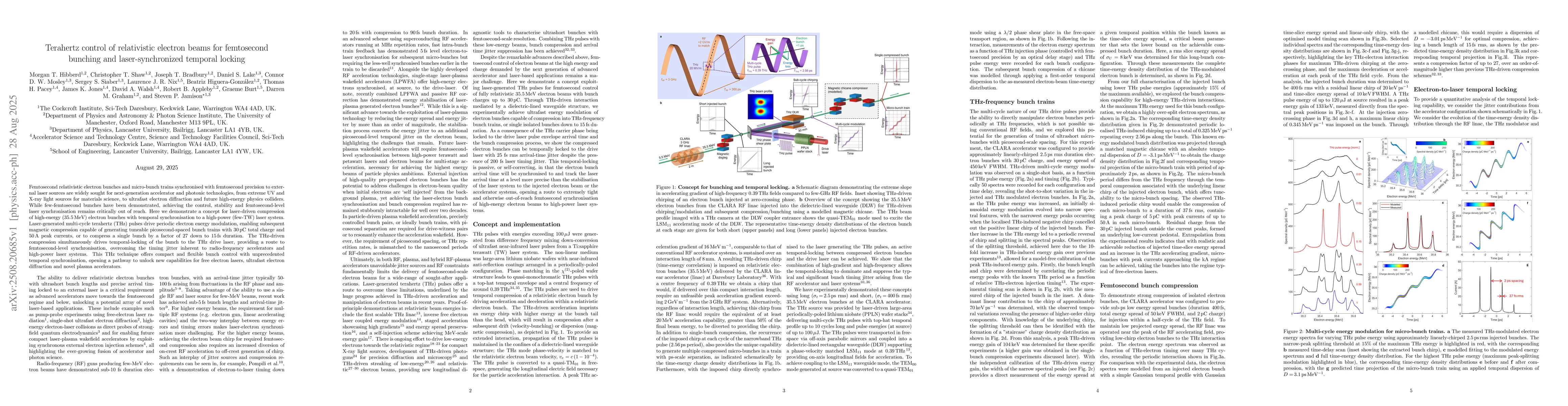 Femtosecond relativistic electron bunches and micro-bunch trains synchronised with femtosecond precision to external laser sources are widely sought for next-generation accelerator and photonic technologies, from extreme UV and X-ray light sources for materials science, to ultrafast electron diffraction and future high-energy physics colliders. While few-femtosecond bunches have been demonstrated, achieving the control, stability and femtosecond-level laser synchronisation remains critically out of reach. Here we demonstrate a concept for laser-driven compression of high-energy (35.5 MeV) electron bunches with temporal synchronisation to a high-power (few-TW) laser system. Laser-generated multi-cycle terahertz (THz) pulses drive periodic electron energy modulation, enabling subsequent magnetic compression capable of generating tuneable picosecond-spaced bunch trains with 30 pC total charge and 50 A peak currents, or to compress a single bunch by a factor of 27 down to 15 fs duration. The THz-driven compression simultaneously drives temporal-locking of the bunch to the THz drive laser, providing a route to femtosecond-level synchronisation, overcoming the timing jitter inherent to radio-frequency accelerators and high-power laser systems. This THz technique offers compact and flexible bunch control with unprecedented temporal synchronisation, opening a pathway to unlock new capabilities for free electron lasers, ultrafast electron diffraction and novel plasma accelerators.