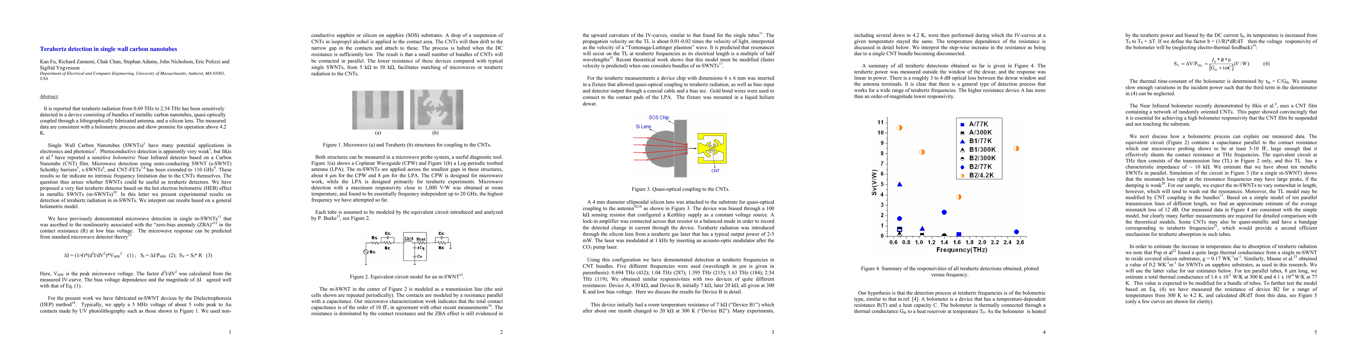 The study demonstrates the sensitive detection of terahertz radiation (0.69 THz to 2.54 THz) in metallic single-wall carbon nanotube bundles using a quasi-optical coupling method, indicating potential performance above 4.2 K. The results align with a bolometric detection mechanism.