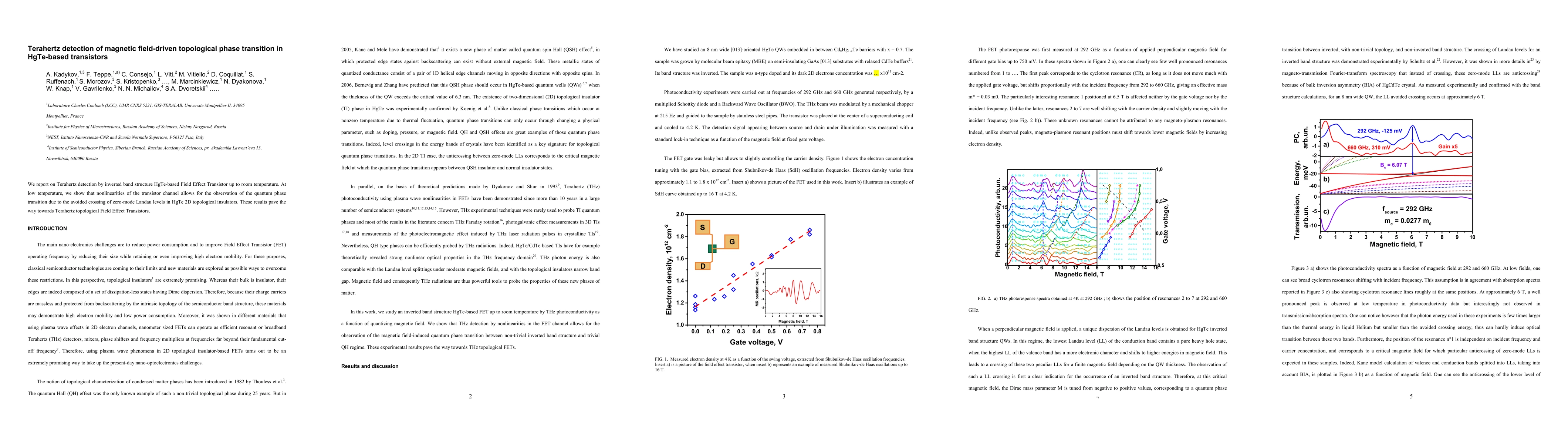We report on Terahertz detection by inverted band structure HgTe-based Field Effect Transistor up to room temperature. At low temperature, we show that nonlinearities of the transistor channel allows for the observation of the quantum phase transition due to the avoided crossing of zero-mode Landau levels in HgTe 2D topological insulators. These results pave the way towards Terahertz topological Field Effect Transistors.