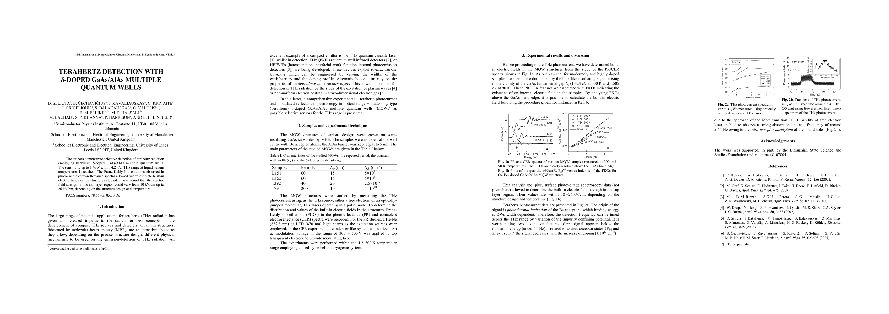The use of delta-doped GaAs/AlAs multiple quantum wells for selective terahertz detection and the estimation of built-in electric fields using Franz-Keldysh oscillations.