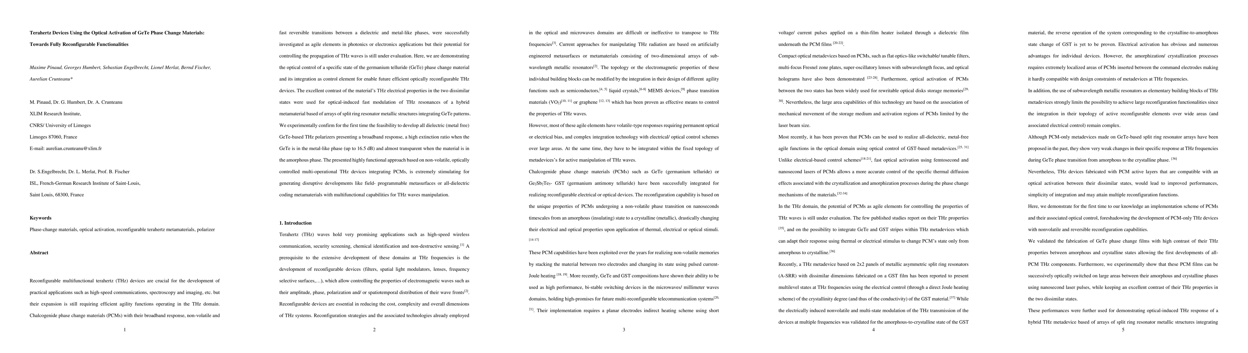 This paper demonstrates the optical activation of germanium telluride (GeTe) phase change material to control THz devices, achieving efficient, reconfigurable functionalities. The study confirms the feasibility of developing metal-free, broadband GeTe-based THz polarizers with high extinction ratios and multifunctional capabilities for THz waves manipulation.