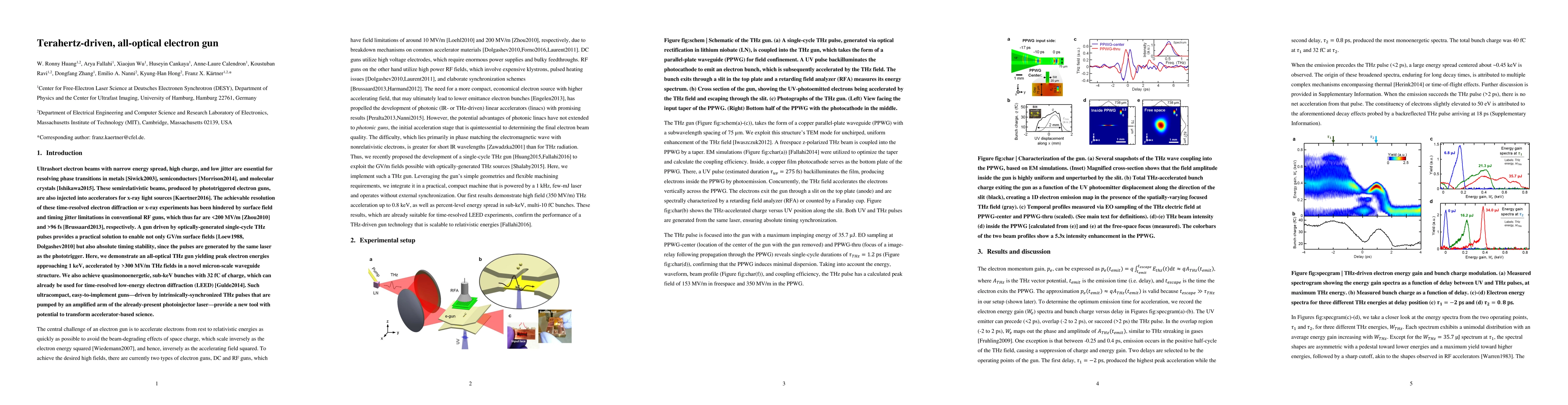 This paper presents an all-optical electron gun driven by terahertz pulses, achieving peak electron energies of nearly 1 keV and 300 MV/m surface fields in a micron-scale waveguide. The design promises ultracompact, synchronized electron beams with high charge and low timing jitter, potentially revolutionizing time-resolved electron diffraction and accelerator-based science.