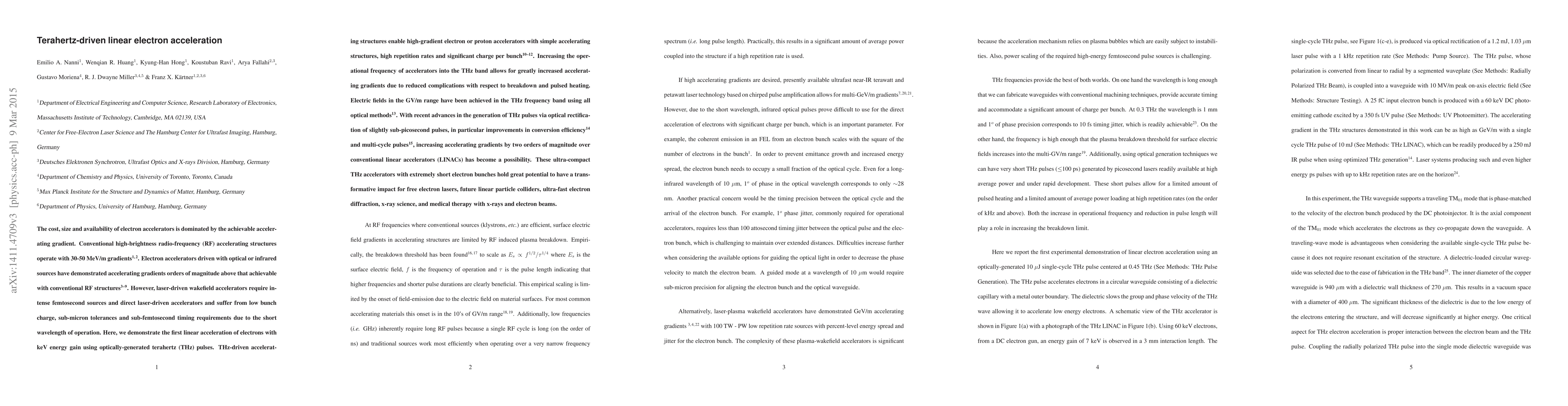 The cost, size and availability of electron accelerators is dominated by the achievable accelerating gradient. Conventional high-brightness radio-frequency (RF) accelerating structures operate with 30-50 MeV/m gradients. Electron accelerators driven with optical or infrared sources have demonstrated accelerating gradients orders of magnitude above that achievable with conventional RF structures. However, laser-driven wakefield accelerators require intense femtosecond sources and direct laser-driven accelerators and suffer from low bunch charge, sub-micron tolerances and sub-femtosecond timing requirements due to the short wavelength of operation. Here, we demonstrate the first linear acceleration of electrons with keV energy gain using optically-generated terahertz (THz) pulses. THz-driven accelerating structures enable high-gradient electron or proton accelerators with simple accelerating structures, high repetition rates and significant charge per bunch. Increasing the operational frequency of accelerators into the THz band allows for greatly increased accelerating gradients due to reduced complications with respect to breakdown and pulsed heating. Electric fields in the GV/m range have been achieved in the THz frequency band using all optical methods. With recent advances in the generation of THz pulses via optical rectification of slightly sub-picosecond pulses, in particular improvements in conversion efficiency and multi-cycle pulses, increasing accelerating gradients by two orders of magnitude over conventional linear accelerators (LINACs) has become a possibility. These ultra-compact THz accelerators with extremely short electron bunches hold great potential to have a transformative impact for free electron lasers, future linear particle colliders, ultra-fast electron diffraction, x-ray science, and medical therapy with x-rays and electron beams.