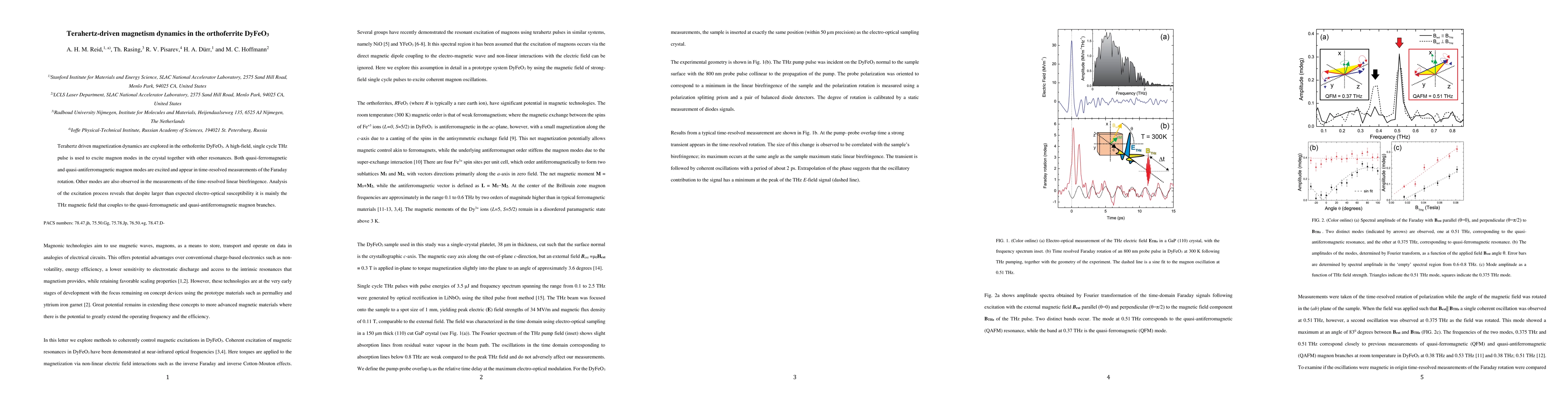 This paper investigates the magnetization dynamics in DyFeO3 driven by terahertz pulses, revealing the excitation of both quasi-ferromagnetic and quasi-antiferromagnetic magnon modes through time-resolved Faraday rotation and linear birefringence measurements. The study finds that the THz magnetic field predominantly couples to these magnon modes despite higher-than-expected electro-optical susceptibility.