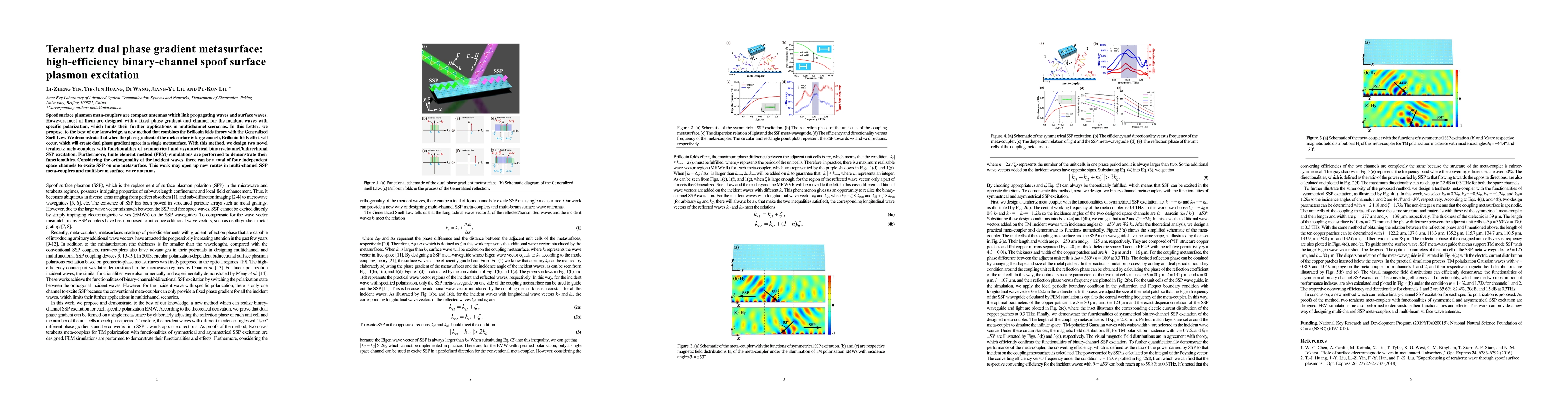 This paper proposes a novel terahertz metasurface with dual phase gradient capabilities, enabling high-efficiency binary-channel spoof surface plasmon excitation. The method combines Brillouin folds theory and Generalized Snell Law to create four independent space channels for SSP excitation, potentially advancing multi-channel meta-couplers and multi-beam surface wave antennas.