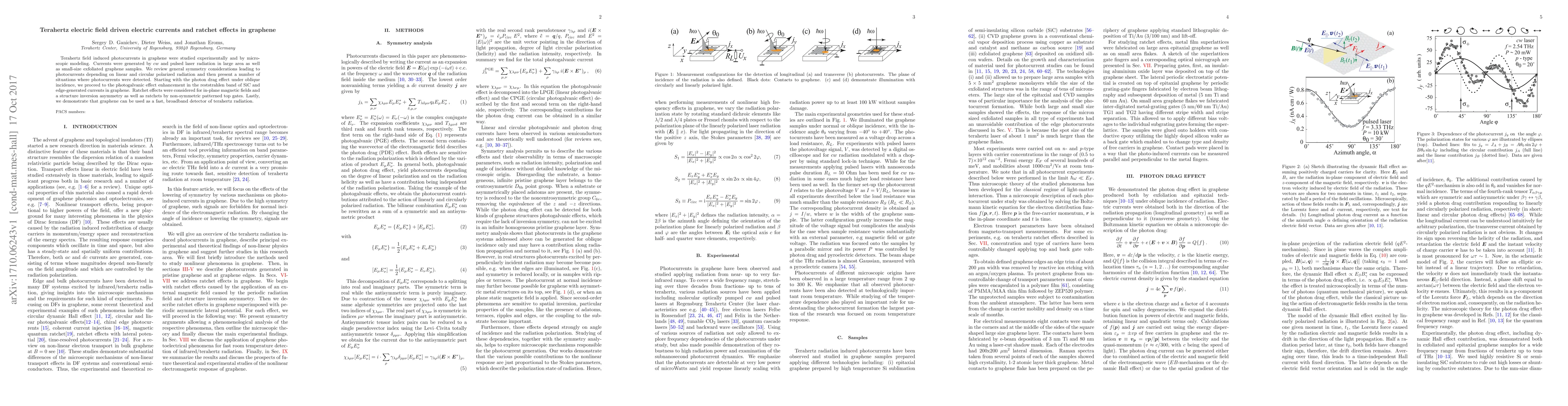 Terahertz field induced photocurrents in graphene were studied experimentally and by microscopic modeling. Currents were generated by cw and pulsed laser radiation in large area as well as small-size exfoliated graphene samples. We review general symmetry considerations leading to photocurrents depending on linear and circular polarized radiation and then present a number of situations where photocurrents were detected. Starting with the photon drag effect under oblique incidence, we proceed to the photogalvanic effect enhancement in the reststrahlen band of SiC and edge-generated currents in graphene. Ratchet effects were considered for in-plane magnetic fields and a structure inversion asymmetry as well as ratchets by non-symmetric patterned top gates. Lastly, we demonstrate that graphene can be used as a fast, broadband detector of terahertz radiation.
