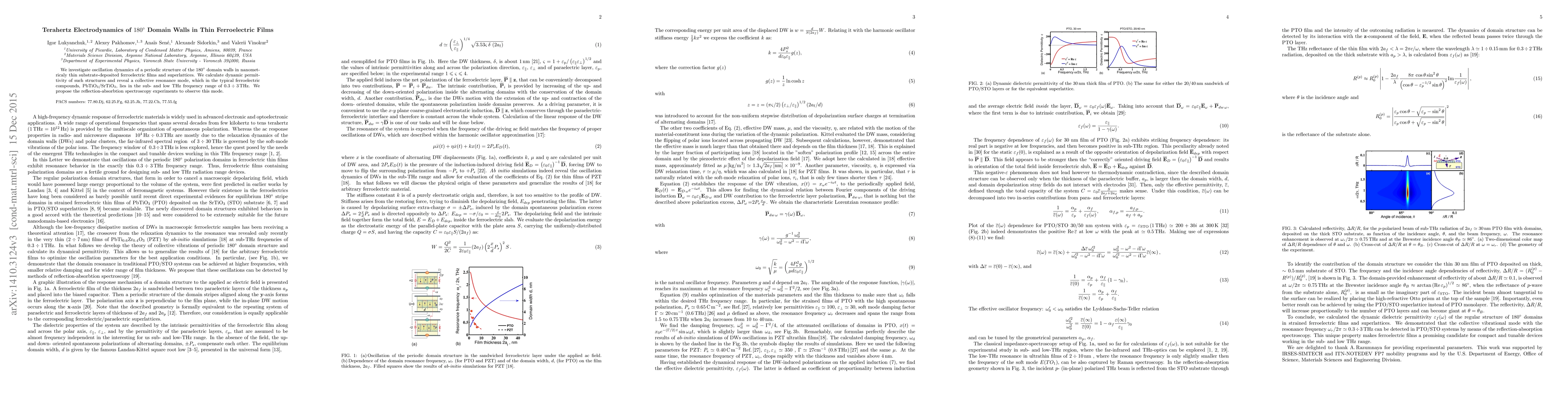 This paper explores the oscillation dynamics of $180^\circ$ domain walls in thin ferroelectric films, revealing a collective resonance mode in the 0.3-3 THz range. The authors propose reflection-absorption spectroscopy to observe this mode in PbTiO3/SrTiO3 superlattices.