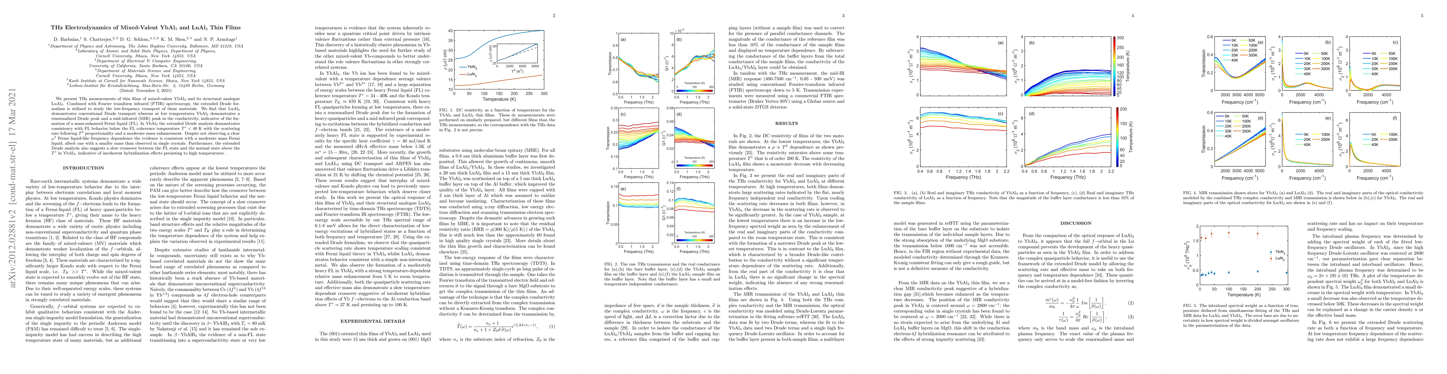 We present THz measurements of thin films of mixed-valent YbAl$_3$ and its structural analogue LuAl$_3$. Combined with traditional Fourier transform infrared (FTIR) spectroscopy, the extended Drude formalism is utilized to study the low-frequency transport of these materials. We find that LuAl$_3$ demonstrates conventional Drude transport whereas at low temperatures YbAl$_3$ demonstrates a sharply renormalized Drude peak and a mid-infrared (MIR) peak in the conductivity, indicative of the formation of a heavy Fermi liquid. In YbAl$_3$ the extended Drude framework shows a consistency of the scattering rate with Fermi-liquid behavior below $T < 40$ K and a moderate mass enhancement. While a $\omega^2$ Fermi liquid-like frequency dependence is not clearly exhibited, the temperature dependence of the Drude scattering rate and effective mass is consistent with the formation of a low-temperature moderately heavy Fermi liquid, albeit one with a smaller mass than observed in single crystals. The extended Drude analysis also supports a slow crossover between the Fermi liquid state and the normal state in YbAl$_3$.