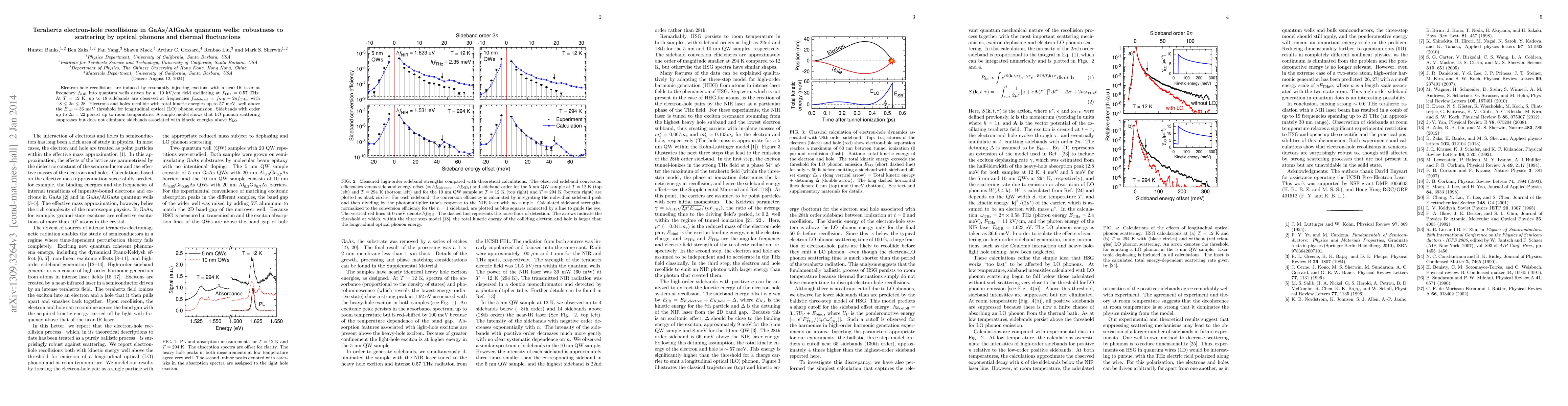 The research demonstrates robust terahertz electron-hole recollisions in GaAs/AlGaAs quantum wells, unaffected by optical phonons and thermal fluctuations up to room temperature. Using a near-IR laser and oscillating field, up to 18 sidebands with energies well above the LO phonon threshold are observed, even at 12 K and persisting to 300 K.