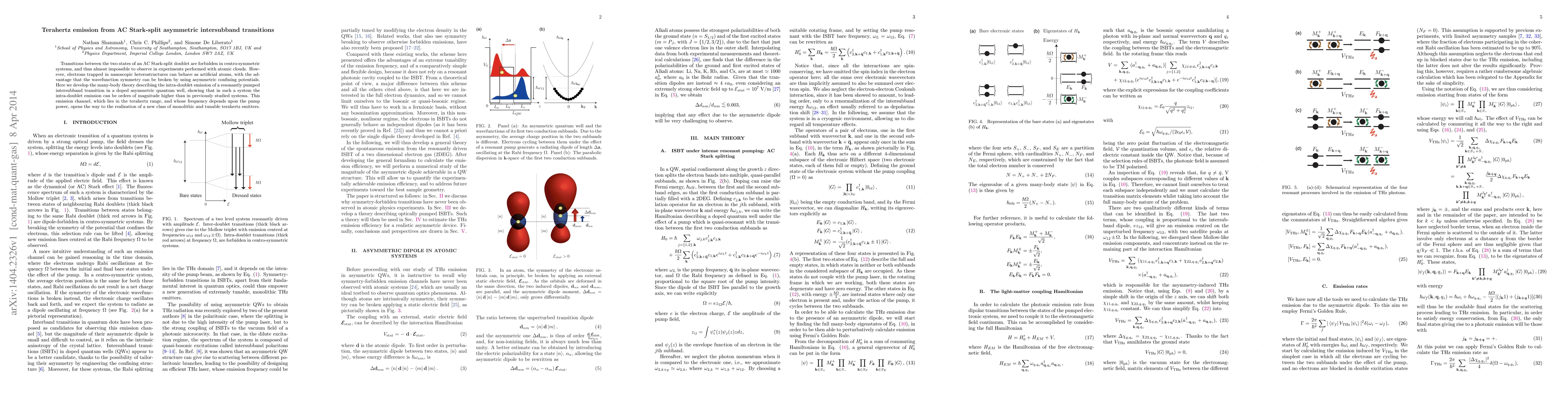Transitions between the two states of an AC Stark-split doublet are forbidden in centro-symmetric systems, and thus almost impossible to observe in experiments performed with atomic clouds. However, electrons trapped in nanoscopic heterostructures can behave as artificial atoms, with the advantage that the wavefunction symmetry can be broken by using asymmetric confining potentials. Here we develop the many-body theory describing the intra-doublet emission of a resonantly pumped intersubband transition in a doped asymmetric quantum well, showing that in such a system the intra-doublet emission can be orders of magnitude higher than in previously studied systems. This emission channel, which lies in the terahertz range, and whose frequency depends upon the pump power, opens the way to the realization of a new class of monolithic and tunable terahertz emitters.