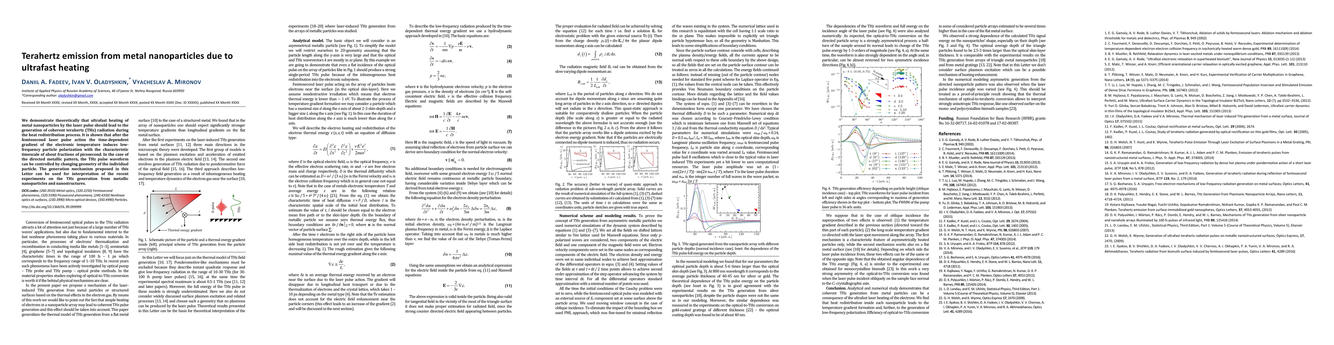 This paper theoretically demonstrates that ultrafast laser heating of metal nanoparticles generates coherent terahertz radiation due to the time-dependent gradient of electronic temperature. The controlled geometry of metallic patterns can manipulate the THz pulse waveform, providing a mechanism for interpreting recent experimental observations of THz emission from such structures.