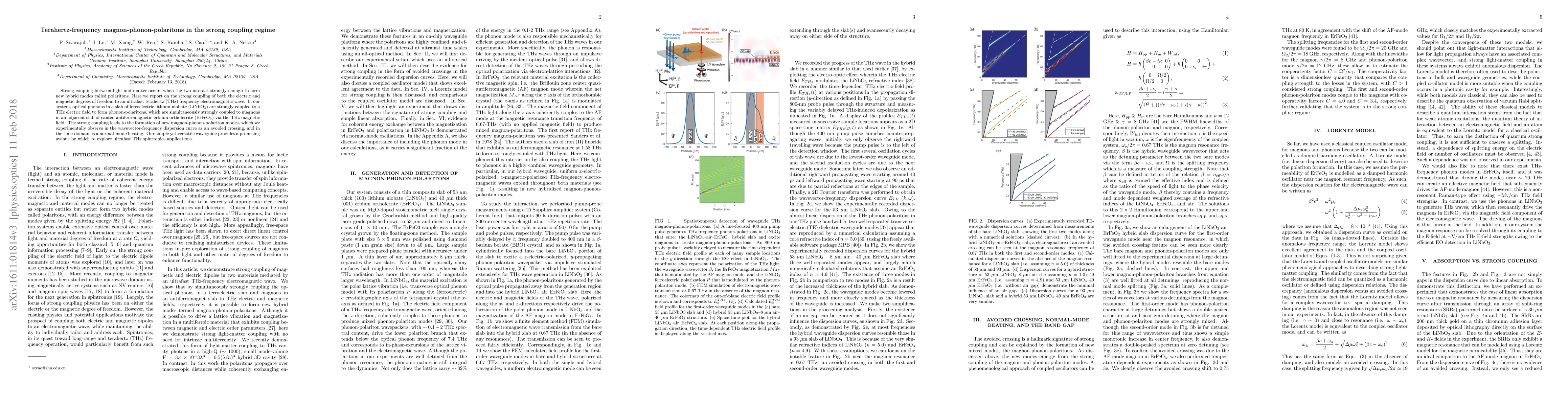 This paper reports on the strong coupling of optical phonons in lithium niobate and magnons in erbium orthoferrite to form hybrid magnon-phonon-polariton modes at terahertz frequencies, observed through wavevector-frequency dispersion and time-domain beating. The on-chip waveguide platform opens new avenues for ultrafast THz spintronics and quantum interactions.