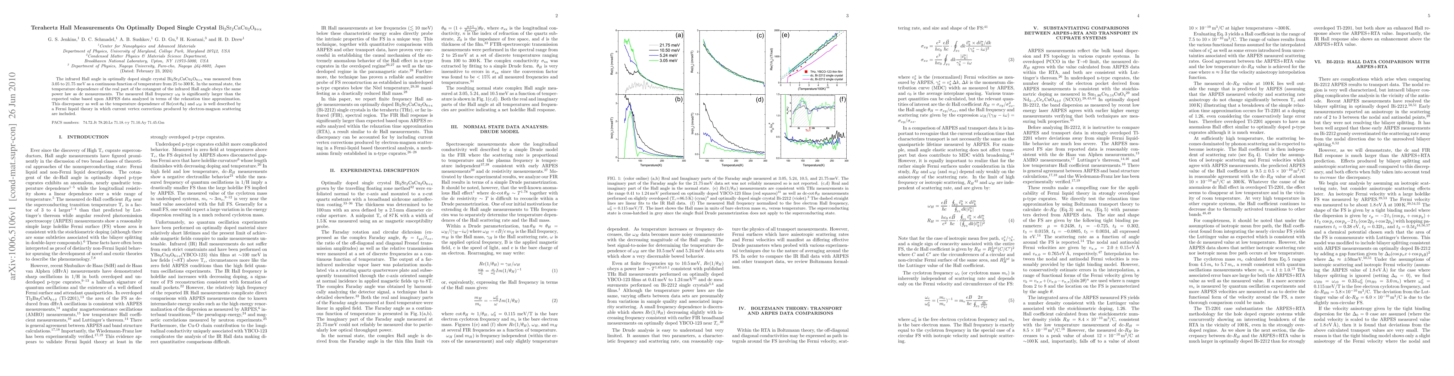 This study measures the infrared Hall angle in optimally doped single crystal Bi-2212 from 3.05 to 21.75 meV, finding a temperature dependence matching dc measurements. The observed Hall frequency significantly exceeds predictions based on ARPES data, a discrepancy explained by Fermi liquid theory incorporating current vertex corrections from electron-magnon scattering.