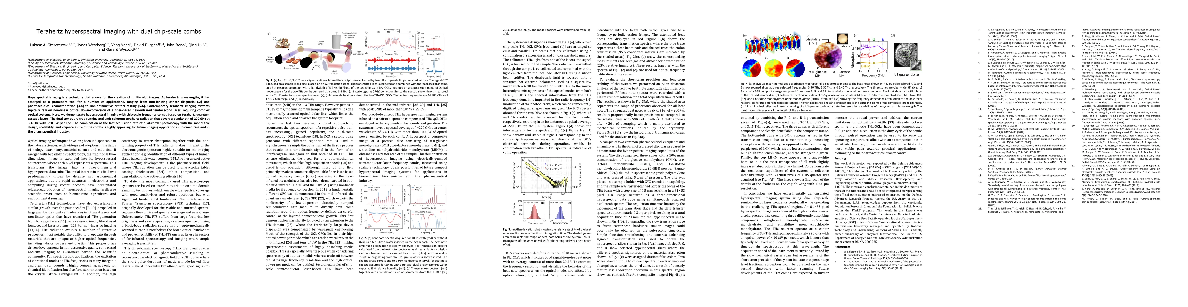 This paper presents a novel hyperspectral imaging method using dual chip-scale frequency combs based on terahertz quantum cascade lasers, offering a compact, scalable solution for applications in biomedicine and pharmaceuticals, and achieving a 220 GHz bandwidth at 3.4 THz. The dual combs' coherent radiation and fast acquisition rate enhance imaging potential.