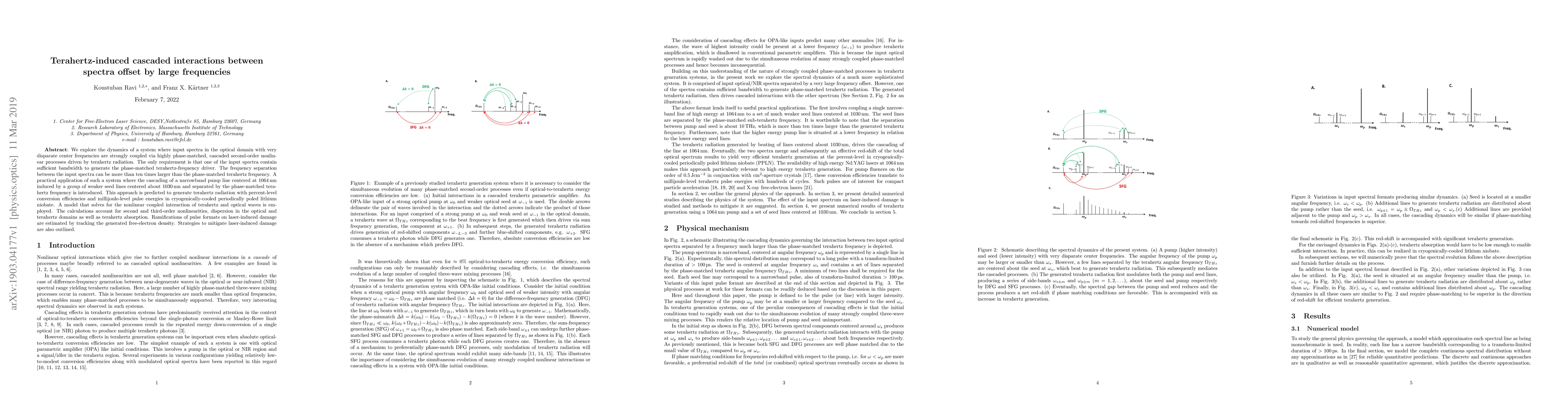We explore the dynamics of a system where input spectra in the optical domain with very disparate center frequencies are strongly coupled via highly phase-matched, cascaded second-order nonlinear processes driven by terahertz radiation. The only requirement is that one of the input spectra contain sufficient bandwidth to generate the phase-matched terahertz-frequency driver. The frequency separation between the input spectra can be more than ten times larger than the phase-matched terahertz frequency. A practical application of such a system where the cascading of a narrowband pump line centered at 1064 nm induced by a group of weaker seed lines centered about 1030 nm and separated by the phase-matched terahertz frequency is introduced. This approach is predicted to generate terahertz radiation with percent-level conversion efficiencies and millijoule-level pulse energies in cryogenically-cooled periodically poled lithium niobate. A model that solves for the nonlinear coupled interaction of terahertz and optical waves is employed. The calculations account for second and third-order nonlinearities, dispersion in the optical and terahertz domains as well as terahertz absorption. Ramifications of pulse formats on laser-induced damage are estimated by tracking the generated free-electron density. Strategies to mitigate laser-induced damage are also outlined.