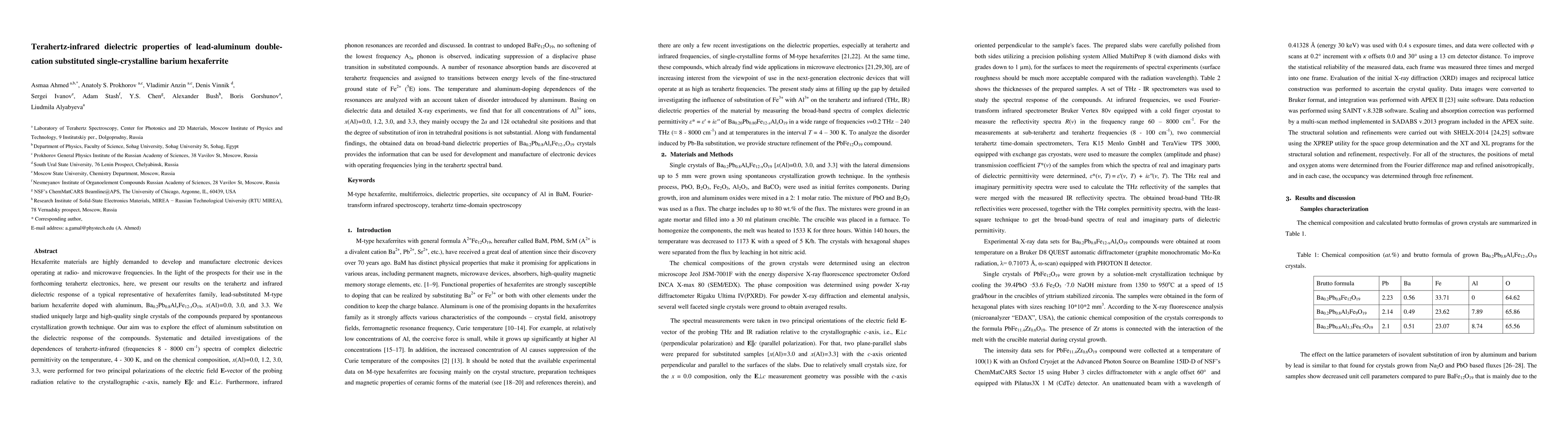 This study investigates the terahertz-infrared dielectric properties of lead-aluminum substituted barium hexaferrite single crystals, revealing resonance absorption bands linked to polar phonons and Fe2+ ion transitions. The research shows that aluminum substitution prevents a displacive phase transition, and provides valuable data for developing terahertz electronic devices.