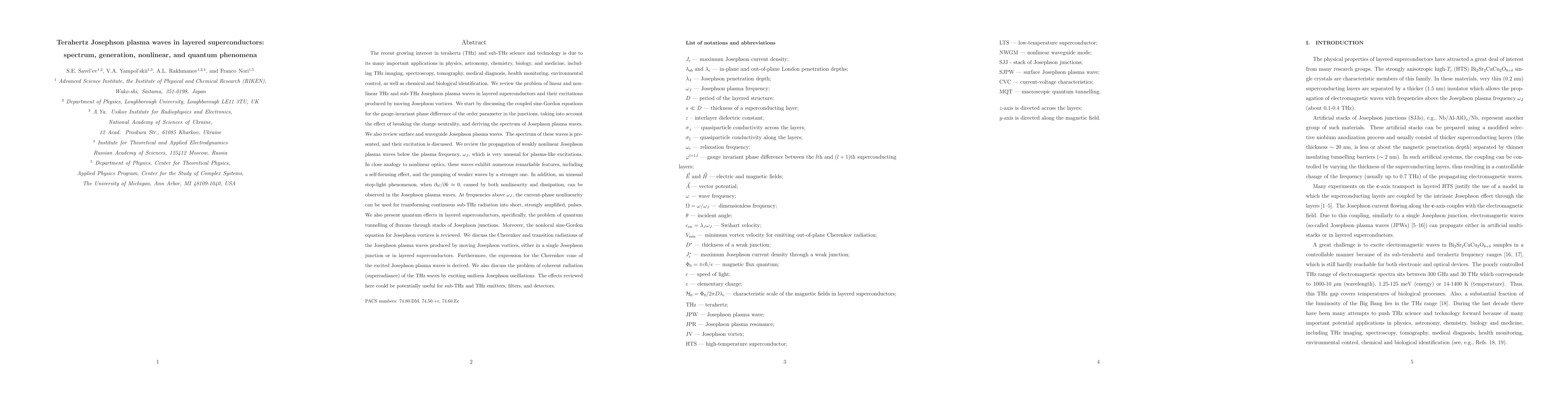 This paper reviews the spectrum, generation, and nonlinear phenomena of terahertz Josephson plasma waves in layered superconductors, including their quantum tunneling and radiation effects. It highlights unique features like self-focusing and the potential for sub-THz and THz emitters, filters, and detectors.