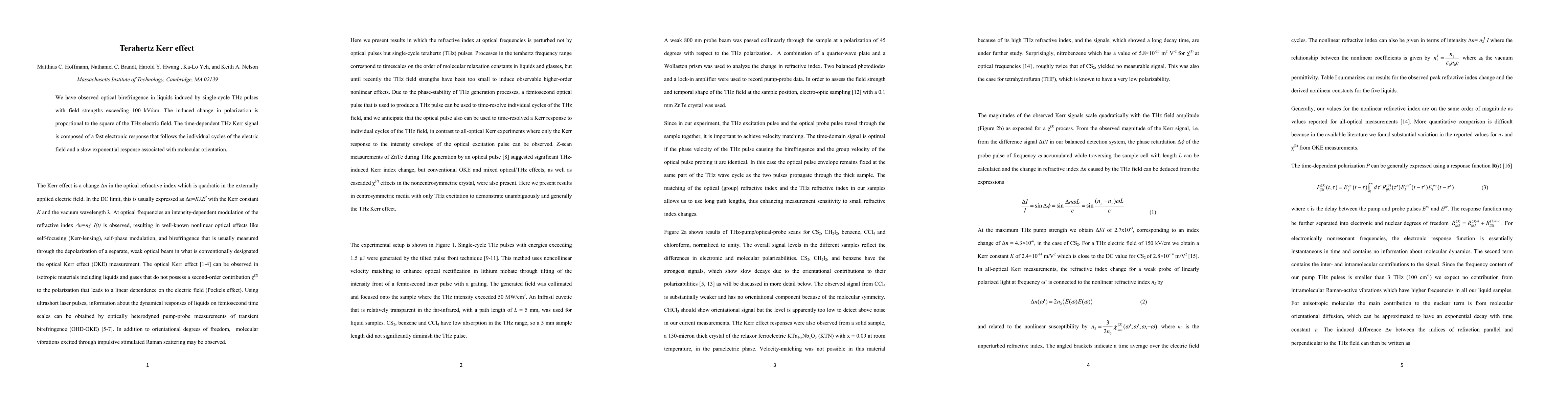Researchers observed THz-induced optical birefringence in liquids with electric field strengths exceeding 100 kV/cm. The response is proportional to the square of the THz electric field and includes both fast electronic and slow exponential components.