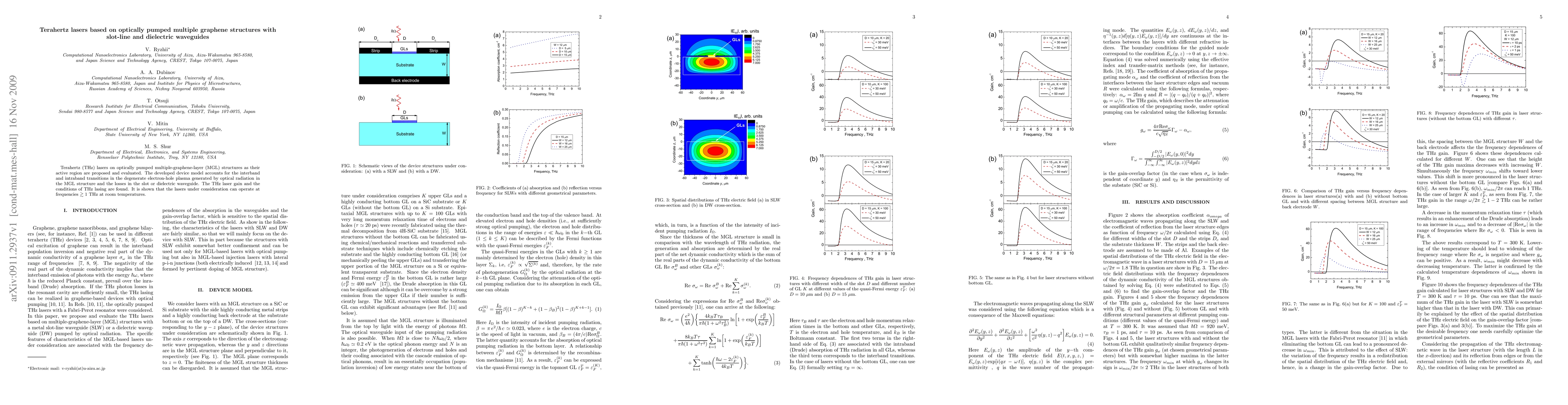 Summary: The paper proposes optically pumped terahertz lasers utilizing multiple graphene-layer structures with slot-line or dielectric waveguides, demonstrating their capability to achieve lasing at frequencies exceeding 1 THz at room temperature through detailed modeling of electron-hole plasma dynamics and waveguide losses.