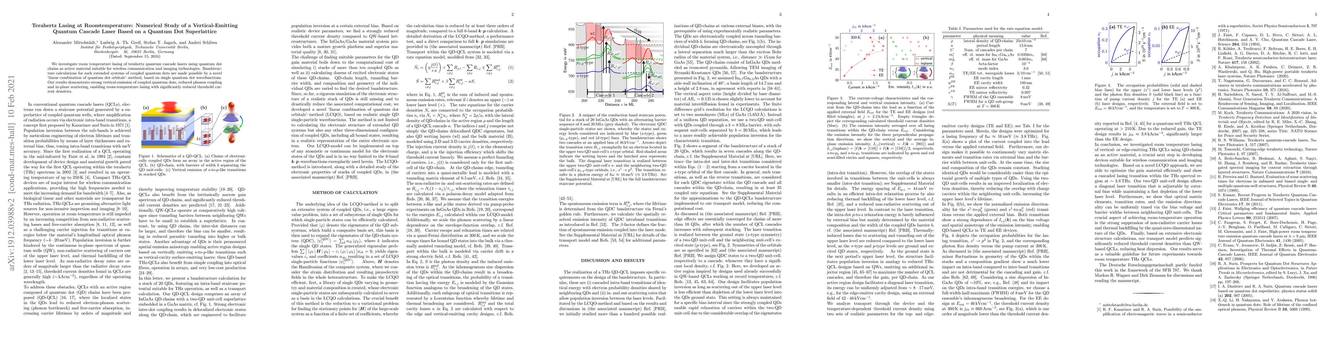 This paper explores room temperature terahertz lasing in quantum cascade lasers utilizing quantum dot superlattices, revealing strong vertical emission and reduced phonon coupling, which lowers threshold current densities for effective operation. The study employs a novel 'linear combination of quantum dot orbitals' method for bandstructure calculations.