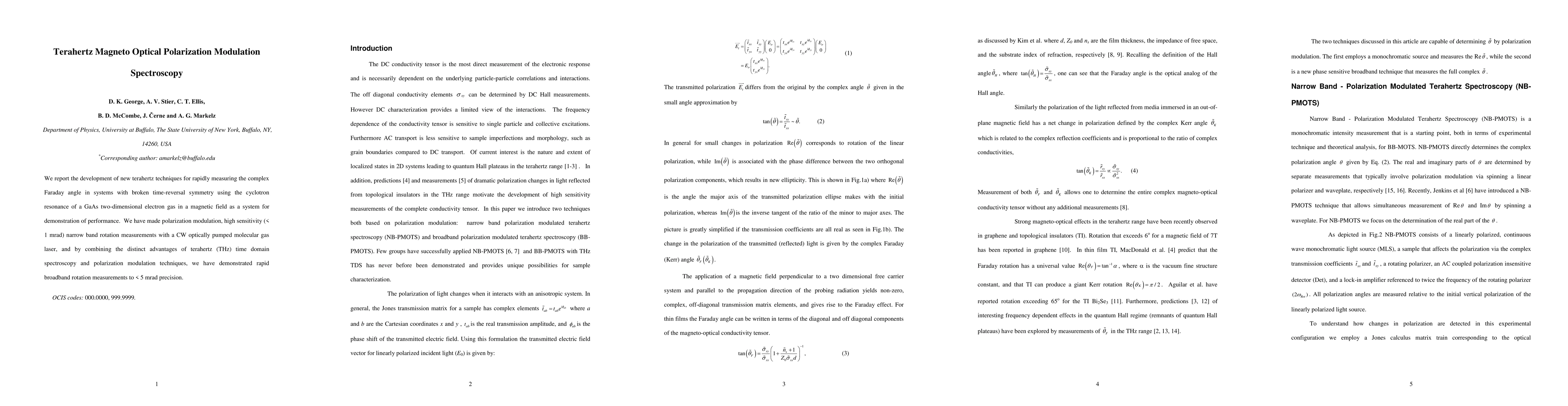 We report the development of new terahertz techniques for rapidly measuring the complex Faraday angle in systems with broken time-reversal symmetry using the cyclotron resonance of a GaAs two-dimensional electron gas in a magnetic field as a system for demonstration of performance. We have made polarization modulation, high sensitivity (< 1 mrad) narrow band rotation measurements with a CW optically pumped molecular gas laser, and by combining the distinct advantages of terahertz (THz) time domain spectroscopy and polarization modulation techniques, we have demonstrated rapid broadband rotation measurements to < 5 mrad precision.