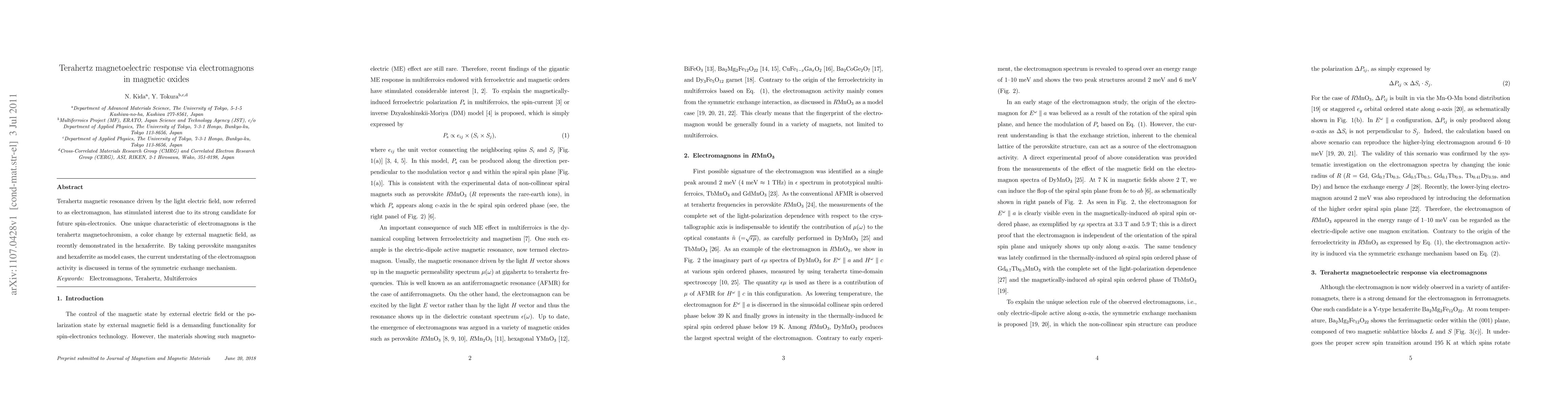 This paper explores the terahertz magnetoelectric response via electromagnons in magnetic oxides, focusing on the terahertz magnetochromism and its potential for future spin-electronics. The study discusses the symmetric exchange mechanism in perovskite manganites and hexaferrite to understand electromagnon activity.