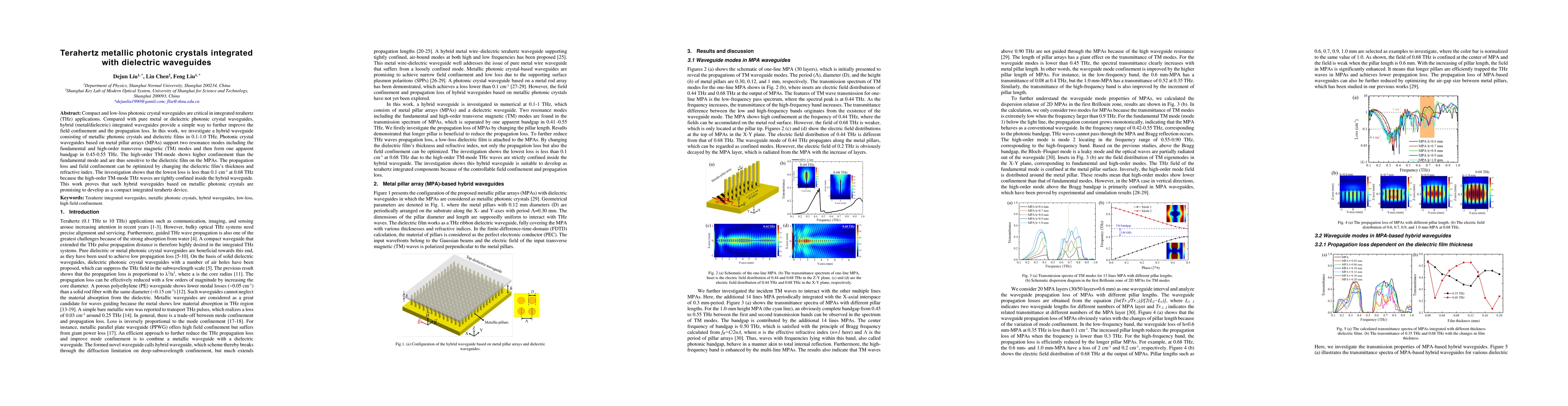 This research investigates hybrid metallic photonic crystal waveguides integrated with dielectric films to improve field confinement and reduce propagation loss in terahertz applications. Optimizing the dielectric film thickness and refractive index leads to the lowest loss at 0.68 THz due to tight confinement of high-order TM modes, demonstrating the potential for compact integrated terahertz devices.