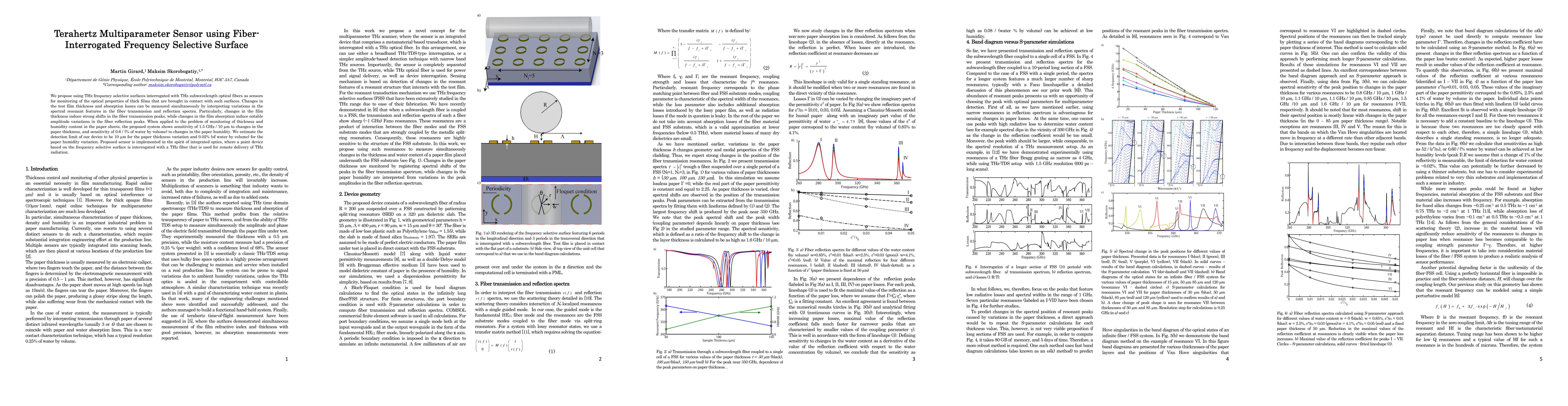 This paper proposes a terahertz multiparameter sensor using fiber-interrogated frequency selective surfaces to monitor optical properties of thick films, such as paper sheets. The sensor measures changes in film thickness and absorption by analyzing spectral resonant features in fiber transmission and reflection spectra, demonstrating high sensitivity and low detection limits for thickness and humidity content.