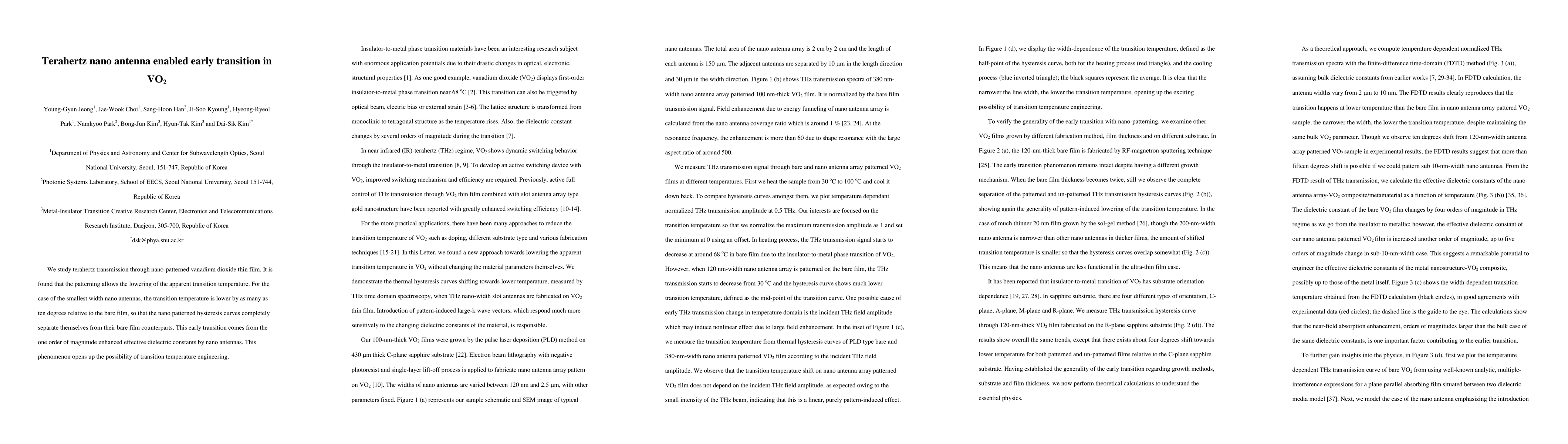 We study terahertz transmission through nano-patterned vanadium dioxide thin film. It is found that the patterning allows the lowering of the apparent transition temperature. For the case of the smallest width nano antennas, the transition temperature is lower by as many as ten degrees relative to the bare film, so that the nano patterned hysteresis curves completely separate themselves from their bare film counterparts. This early transition comes from the one order of magnitude enhanced effective dielectric constants by nano antennas. This phenomenon opens up the possibility of transition temperature engineering.