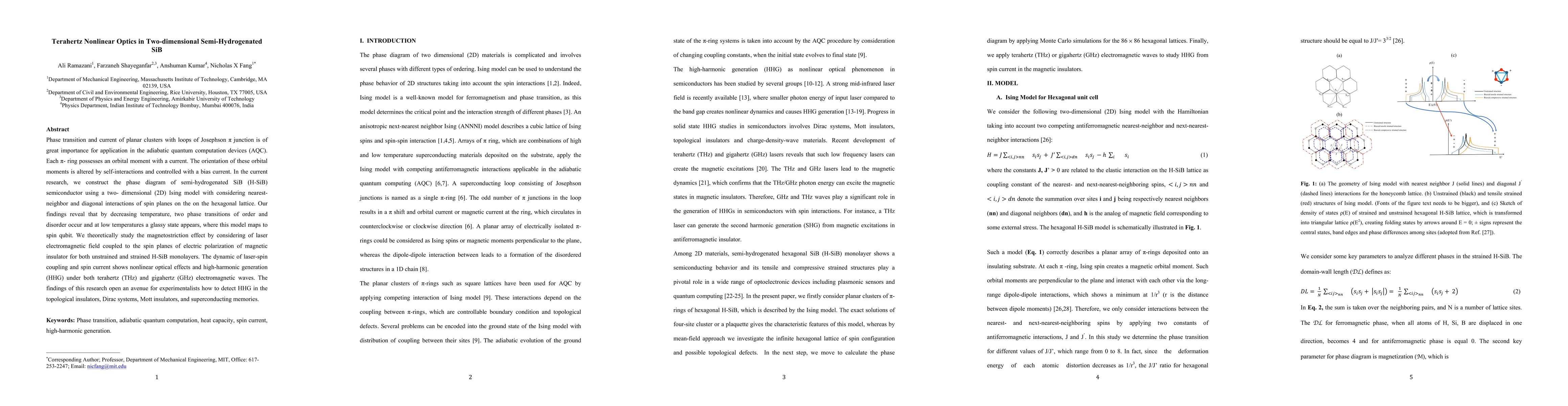Phase transition and current of planar clusters with loops of Josephson $\pi$ junction is of great importance for application in the adiabatic quantum computation devices (AQC). Each $\pi$-ring possesses an orbital moment with a current. The orientation of these orbital moments is altered by self-interactions and controlled with a bias current. In the current research, we construct the phase diagram of semi-hydrogenated SiB (H-SiB) semiconductor using a two-dimensional (2D) Ising model with considering nearest-neighbor and diagonal interactions of spin planes on the on the hexagonal lattice. Our findings reveal that by decreasing temperature, two phase transitions of order and disorder occur and at low temperatures a glassy state appears, where this model maps to spin qubit. We theoretically study the magnetostriction effect by considering of laser electromagnetic field coupled to the spin planes of electric polarization of magnetic insulator for both unstrained and strained H-SiB monolayers. The dynamic of laser-spin coupling and spin current shows nonlinear optical effects and high-harmonic generation (HHG) under both terahertz (THz) and gigahertz (GHz) electromagnetic waves. The findings of this research open an avenue for experimentalists how to detect HHG in the topological insulators, Dirac systems, Mott insulators, and superconducting memories.
