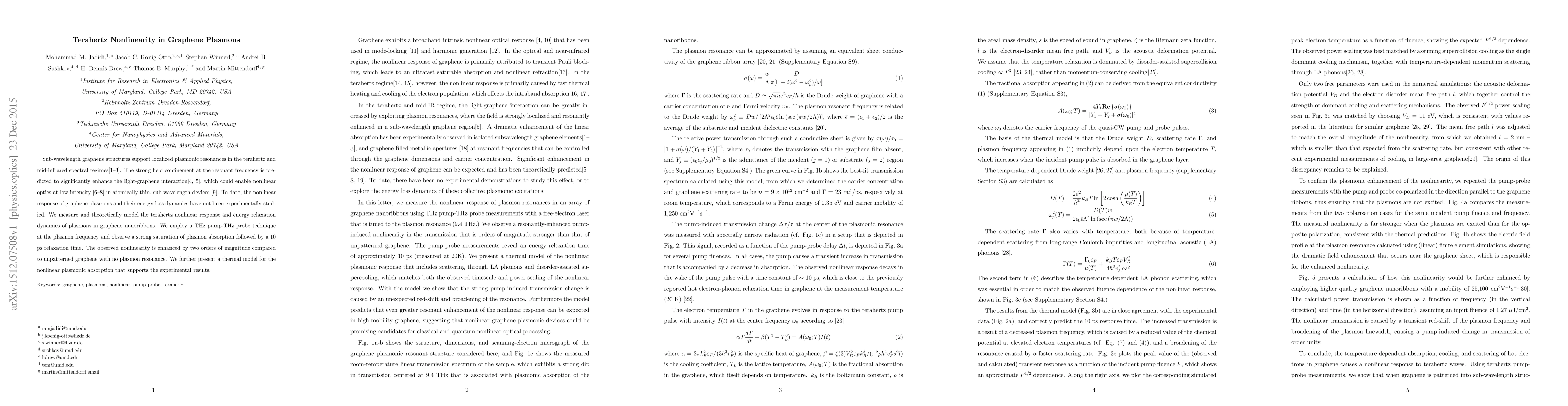 This paper investigates the terahertz nonlinear response of graphene plasmons in nanoribbons, demonstrating a strong saturation of plasmon absorption and a 10 ps relaxation time, which is two orders of magnitude greater than in unpatterned graphene. Theoretical modeling supports these findings with a thermal model for the nonlinear plasmonic absorption.